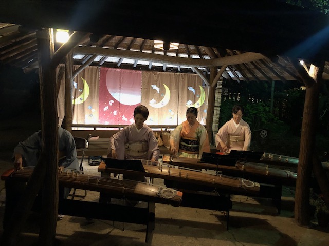 次は、お琴の演奏を聞きに。こちらはかわいいお月見の幕の前で、童謡などが演奏されています。やはり海外の方が、夢中になって動画を撮影していました。