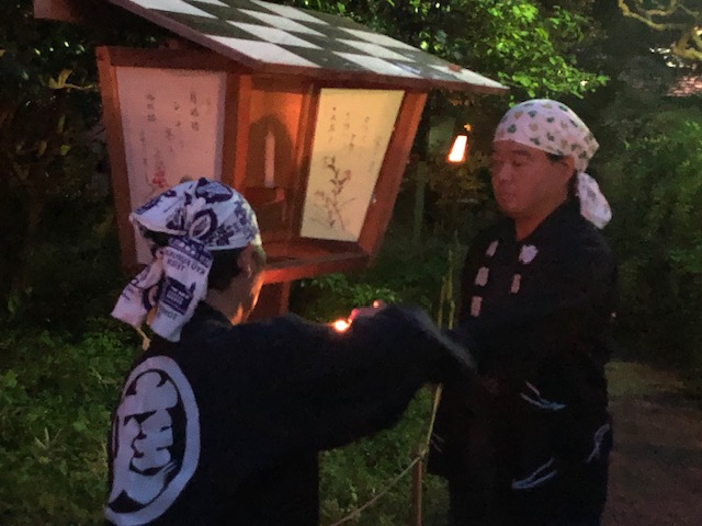 園内にある35か所の行灯を回って点灯していきます。長い木の棒の先にあるろうそくに点火して、それを箱の中のろうそくに移し替えていくのです。