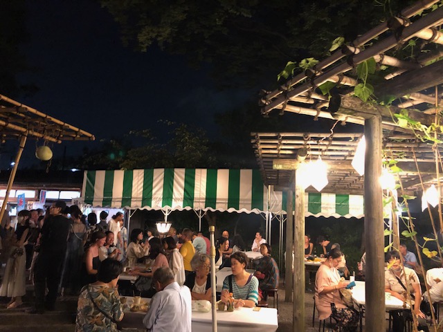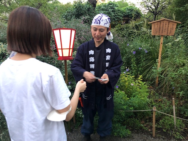 さて、月はどこから出るのかな、と思っているうちに庭園内がにぎわっていきます。売店付近では、言問団子やかき氷など売っていたのですが、みんなアルコールが入り始めた様子。