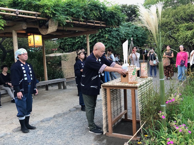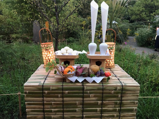 そしてお月見団子のお供えがはじまりました。法被を着た庭師の方々が、手を合わせて捧げています。団子にさといも、茄子に柿など。すすきも相まって、映える要素満載。みんな嬉しそうに撮影しています。