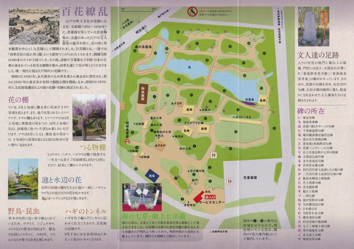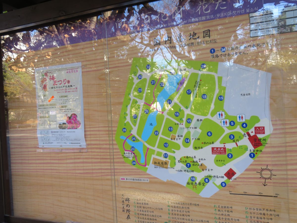 向島百花園入口に掲示される園内マップと2020年の「向島百花園梅まつり」のポスター