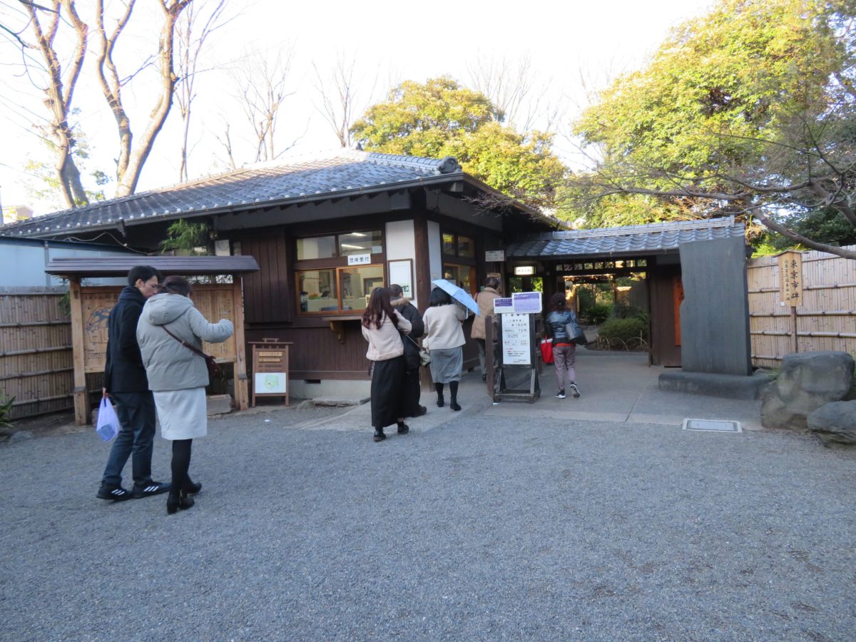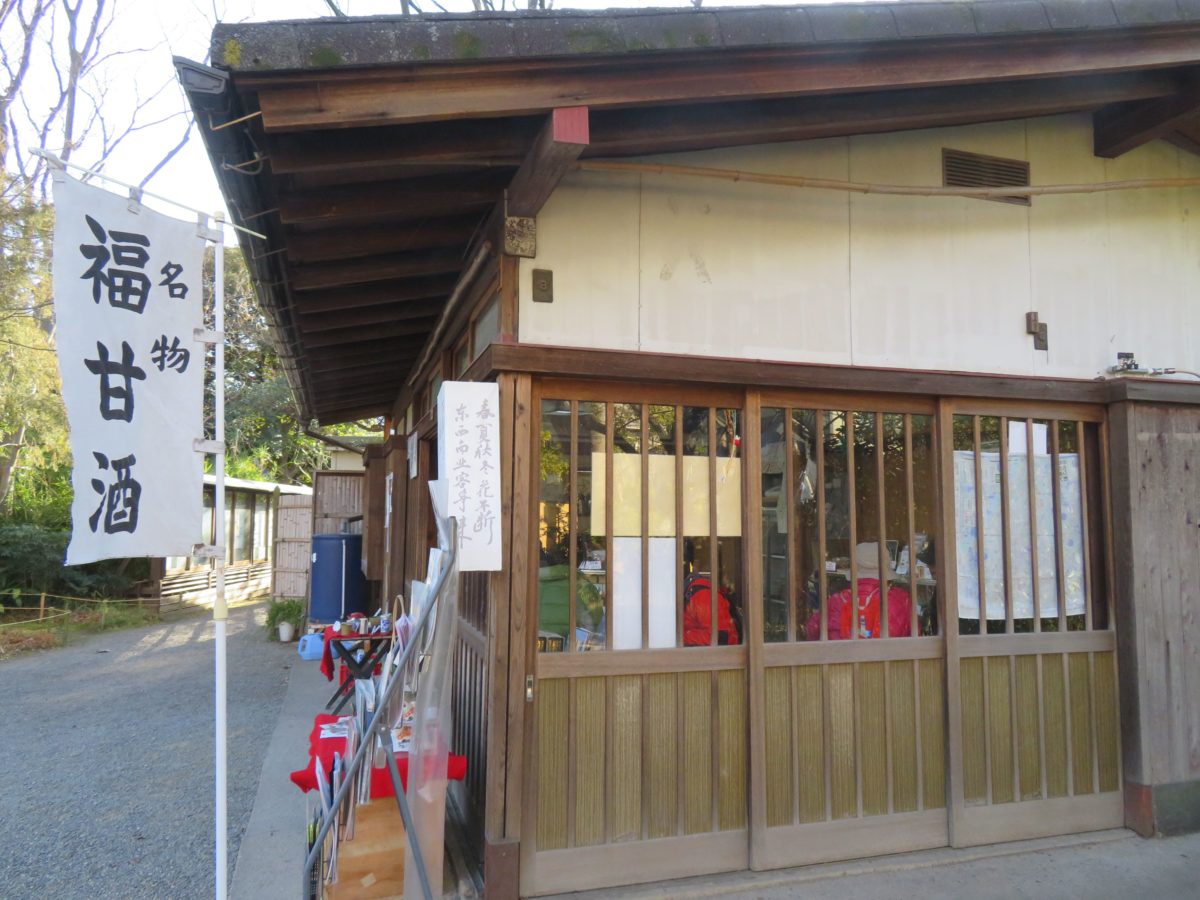 庭門近くの広場の売店では、福甘酒を味わうことができます。