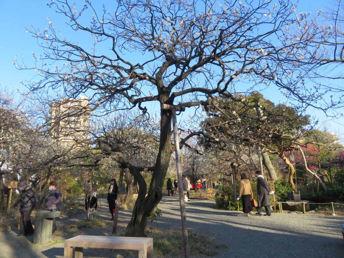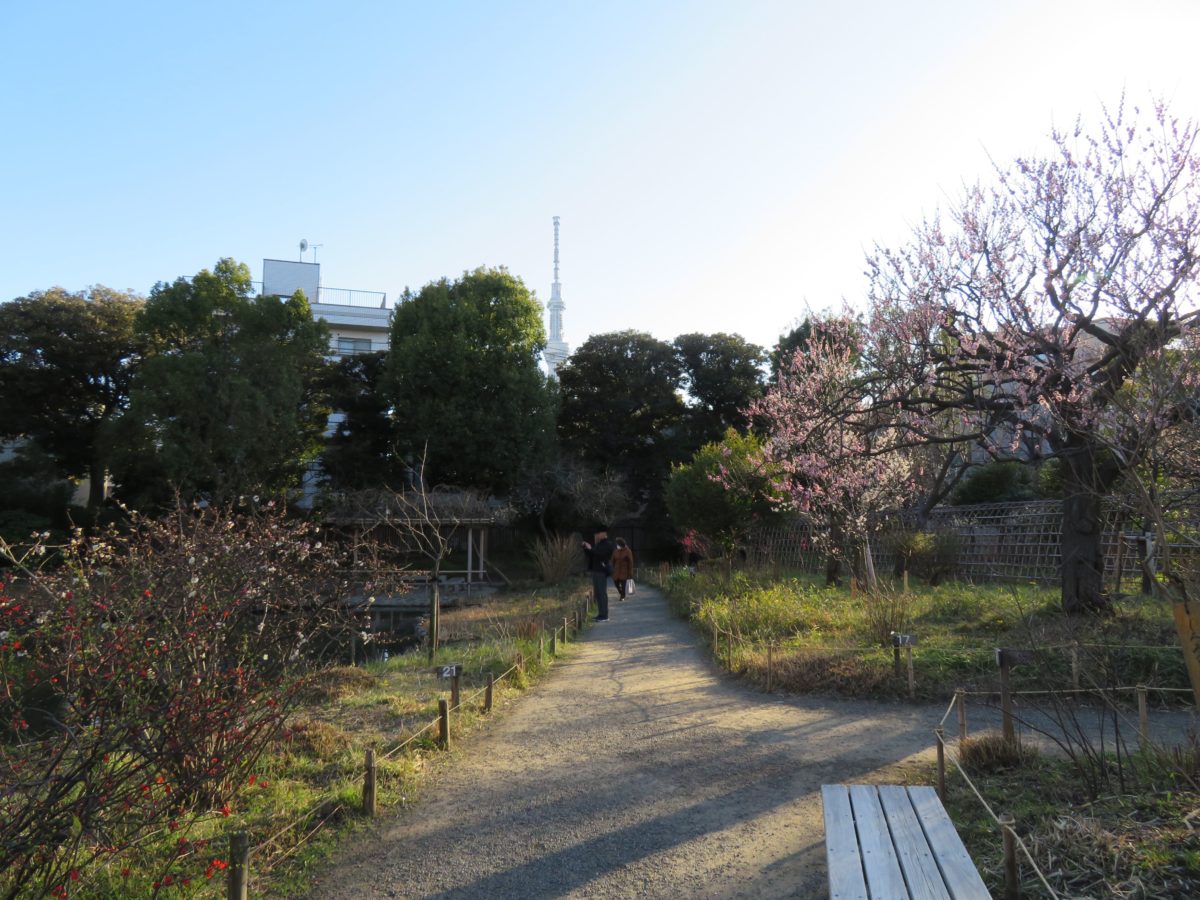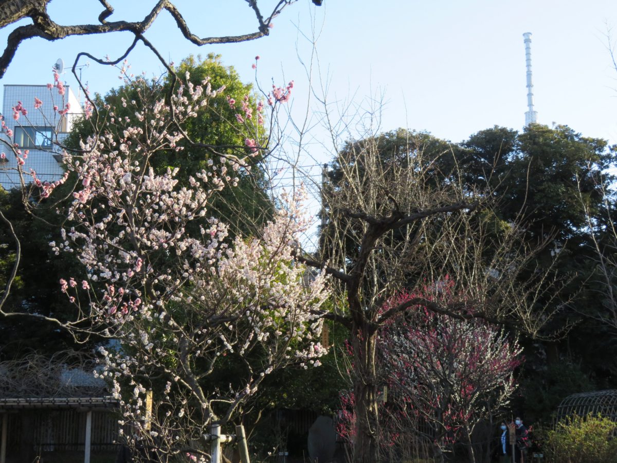 向島百花園の池の端の梅花と東京スカイツリーのコラボ