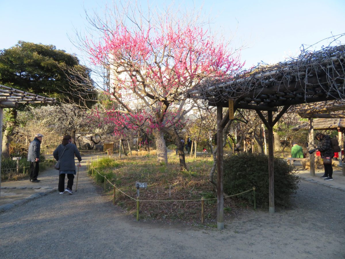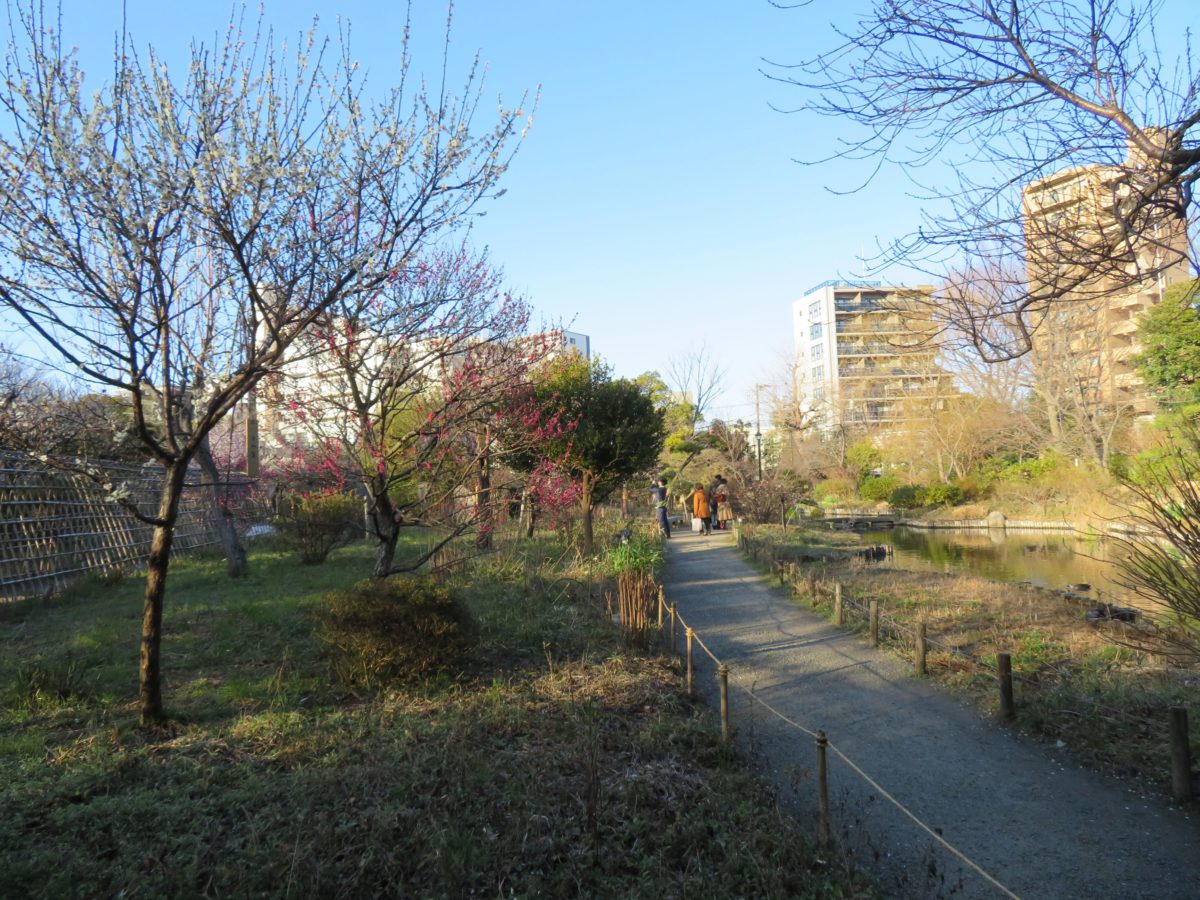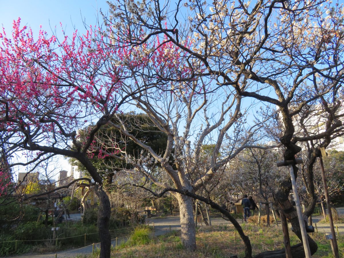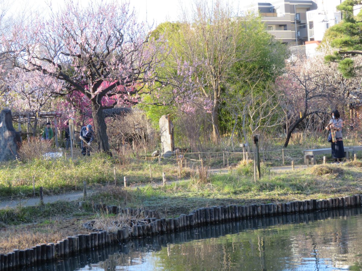池の端にも紅梅、白梅が初春の彩りを放っています。