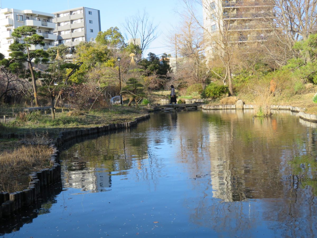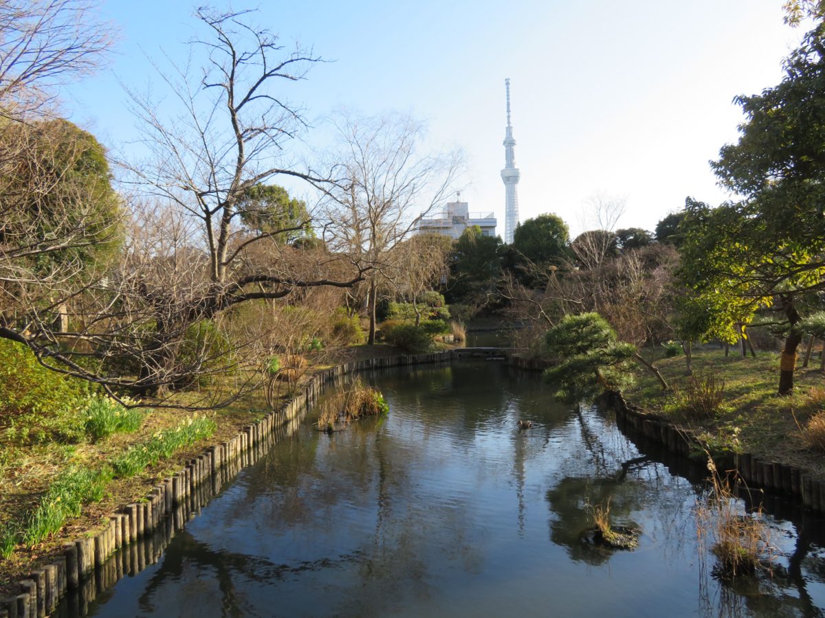 藤棚をさらに奥に進むと、穏やかな水面を湛える池です。池の先には東京スカイツリーの姿を見ることができます。