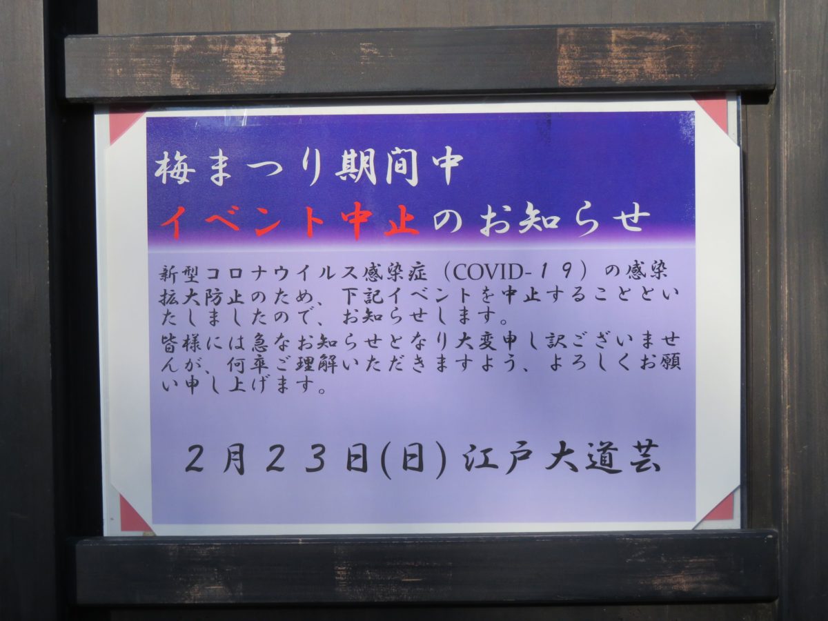 「向島百花園梅まつり」の期間中には休日を中心に、江戸大道芸、すずめ踊り、庭さんぽ、梅を詠むなど、様々なイベントが企画されますが、2020年は大半が中止となってしまいました。