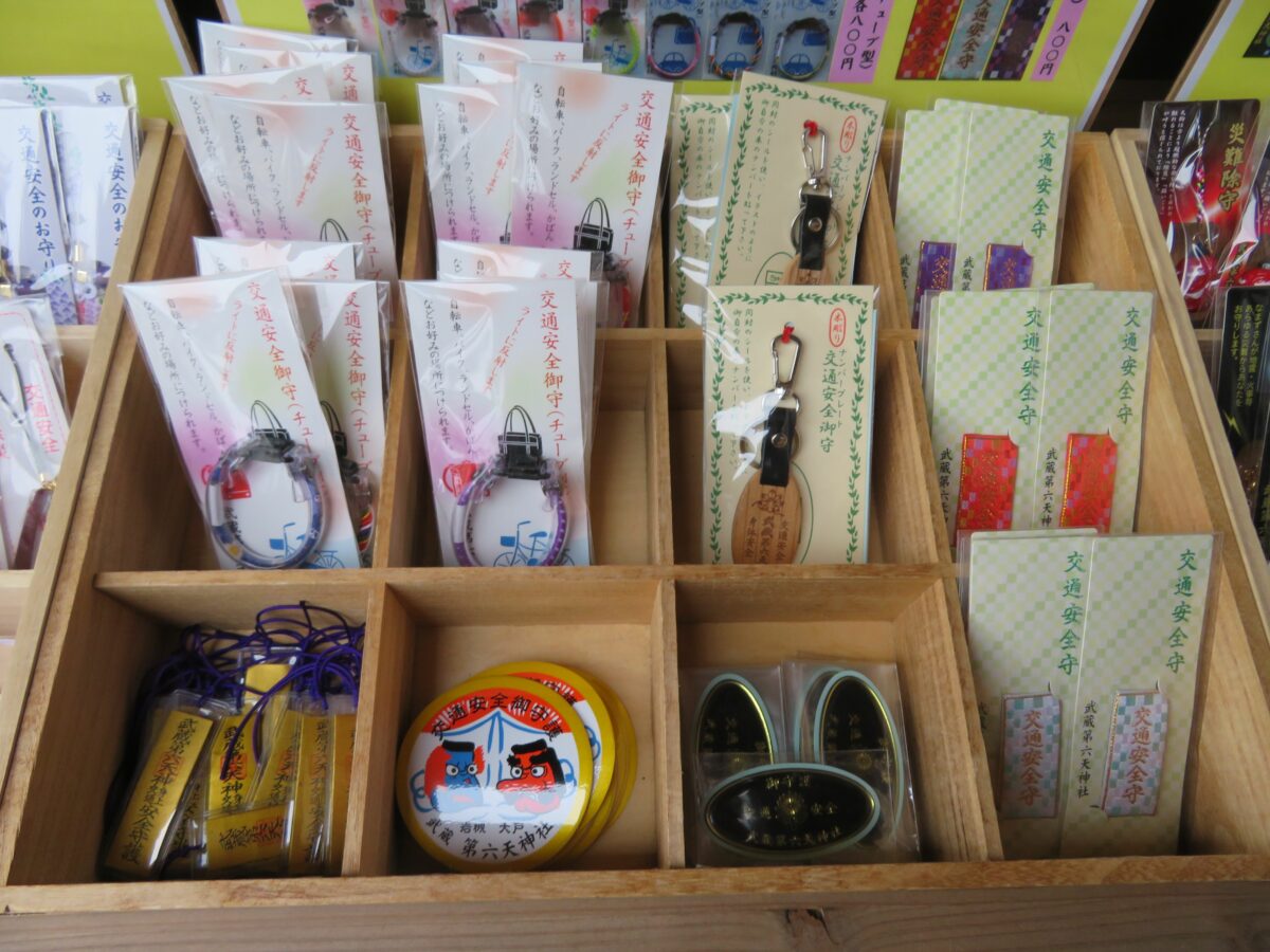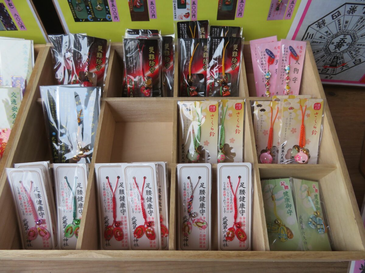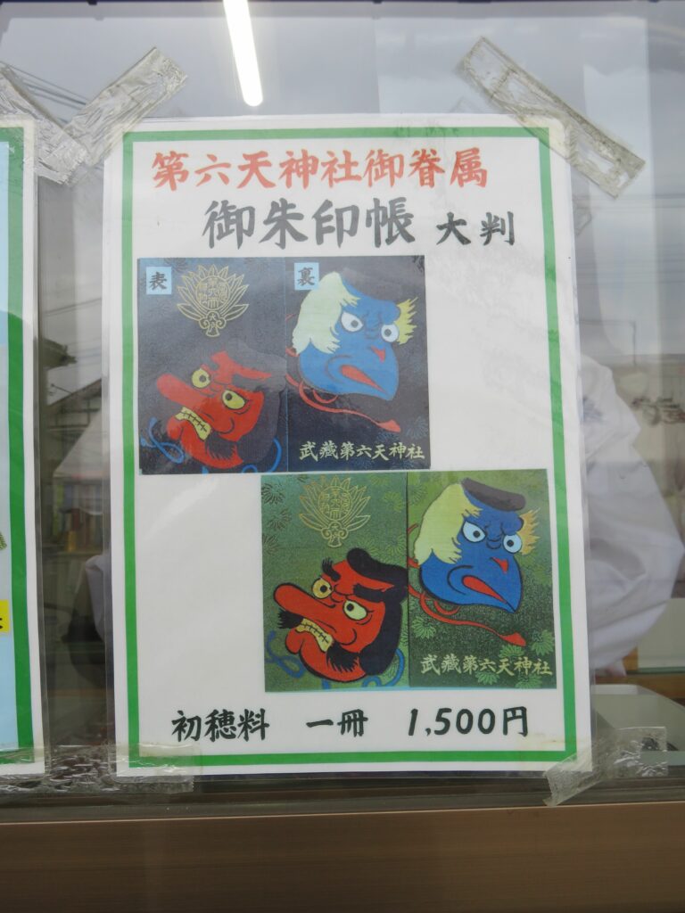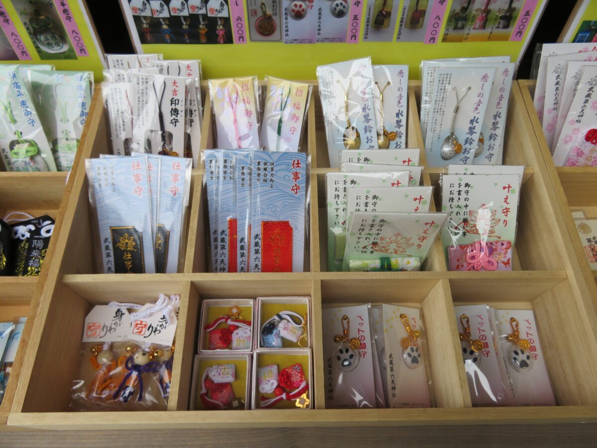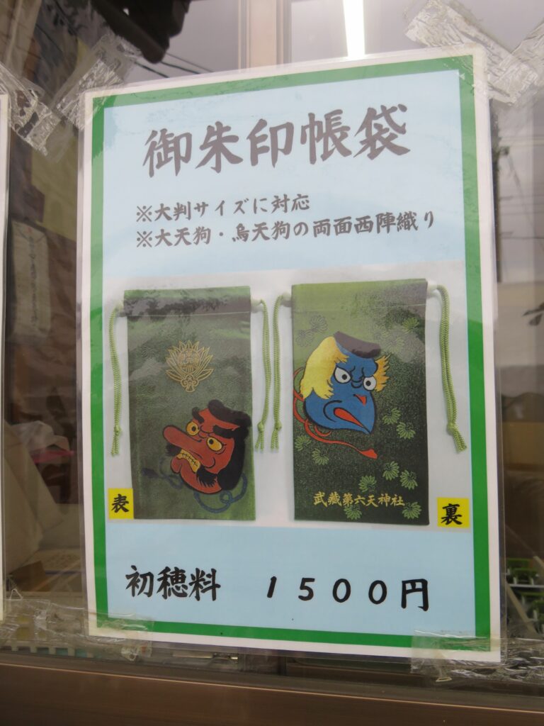 武蔵第六天神社では、拝殿の南に隣接する社務所で御朱印を頂くことができます。窓口にはお守りなど多種理の授与品が並んでいます。