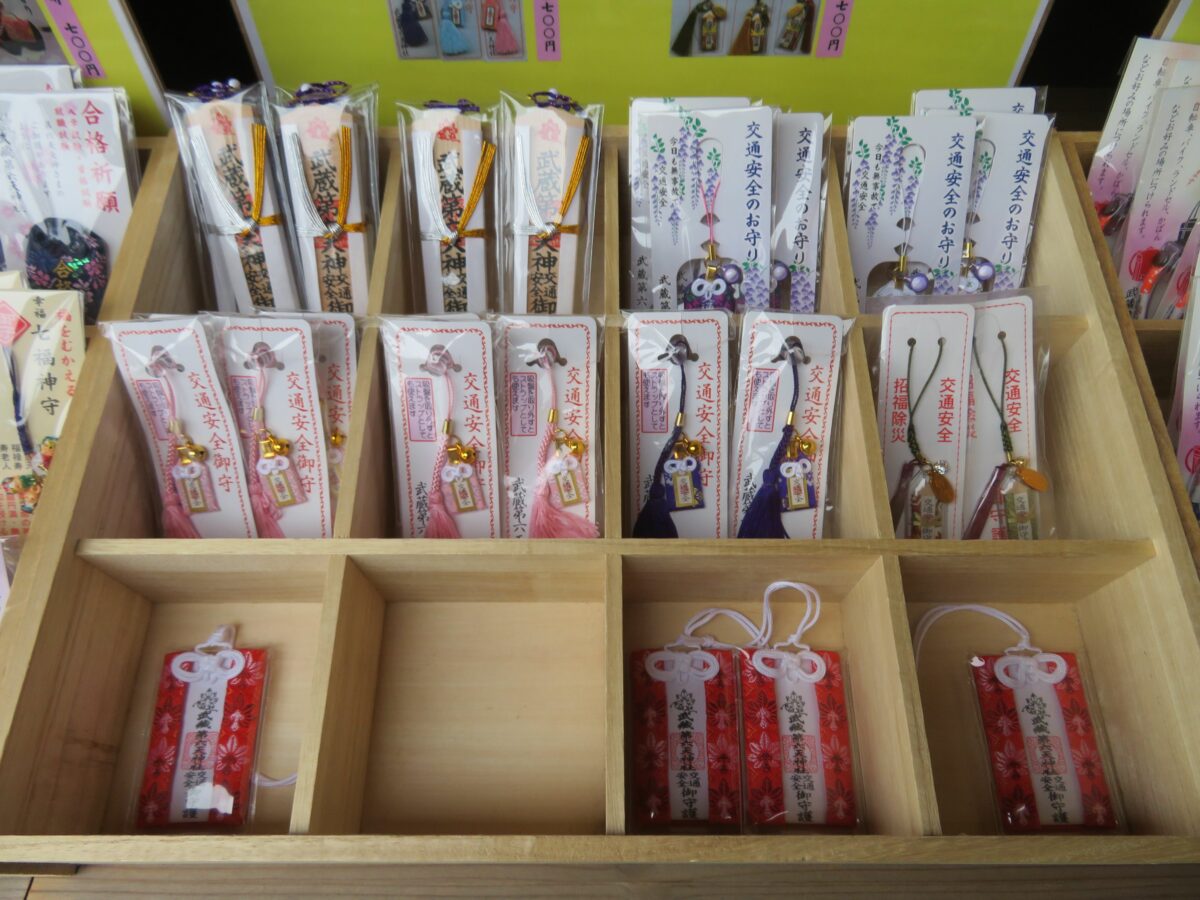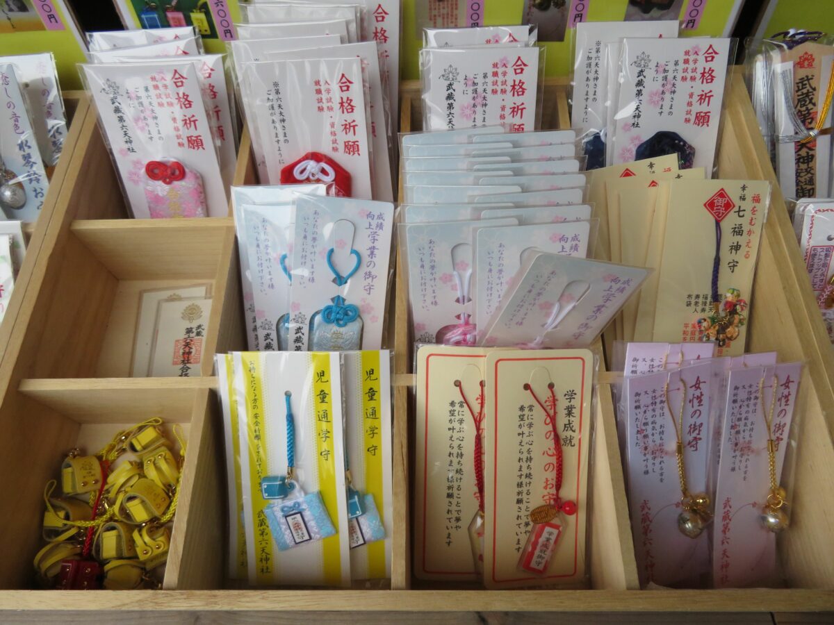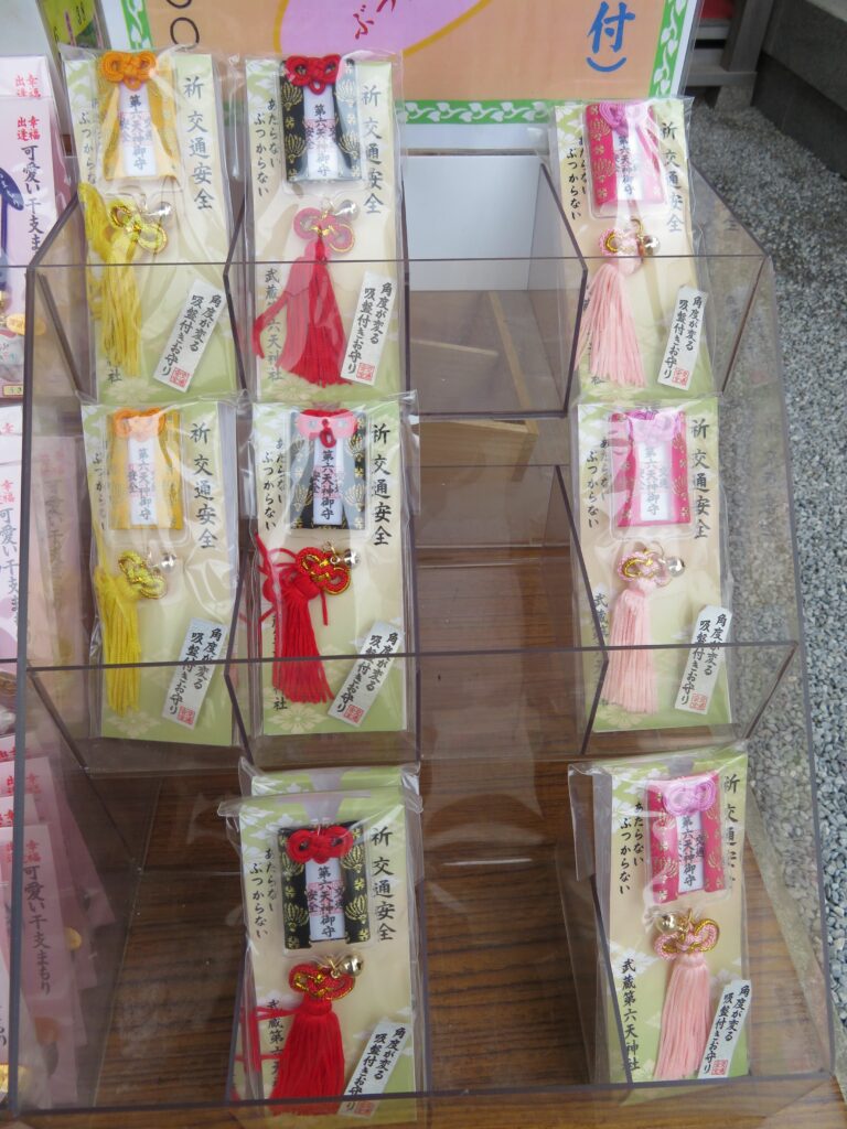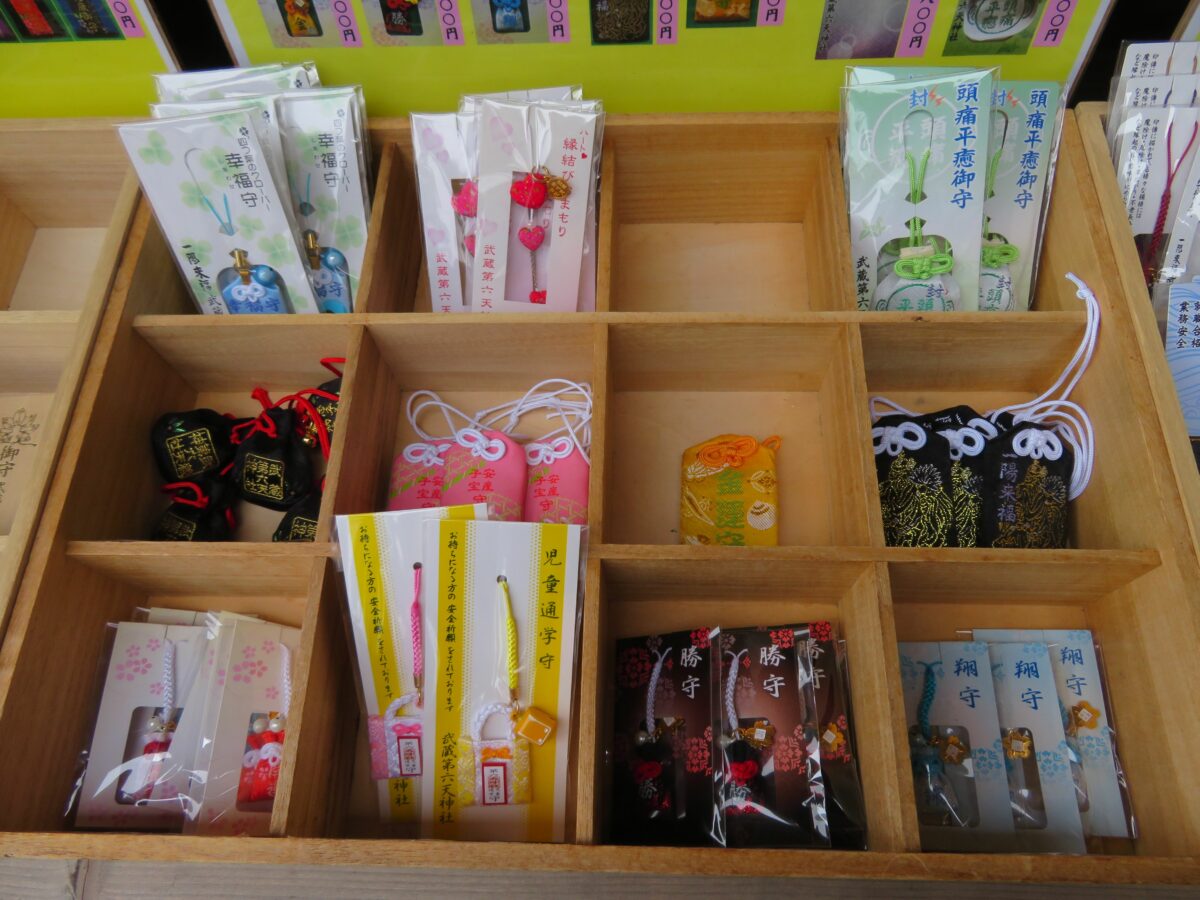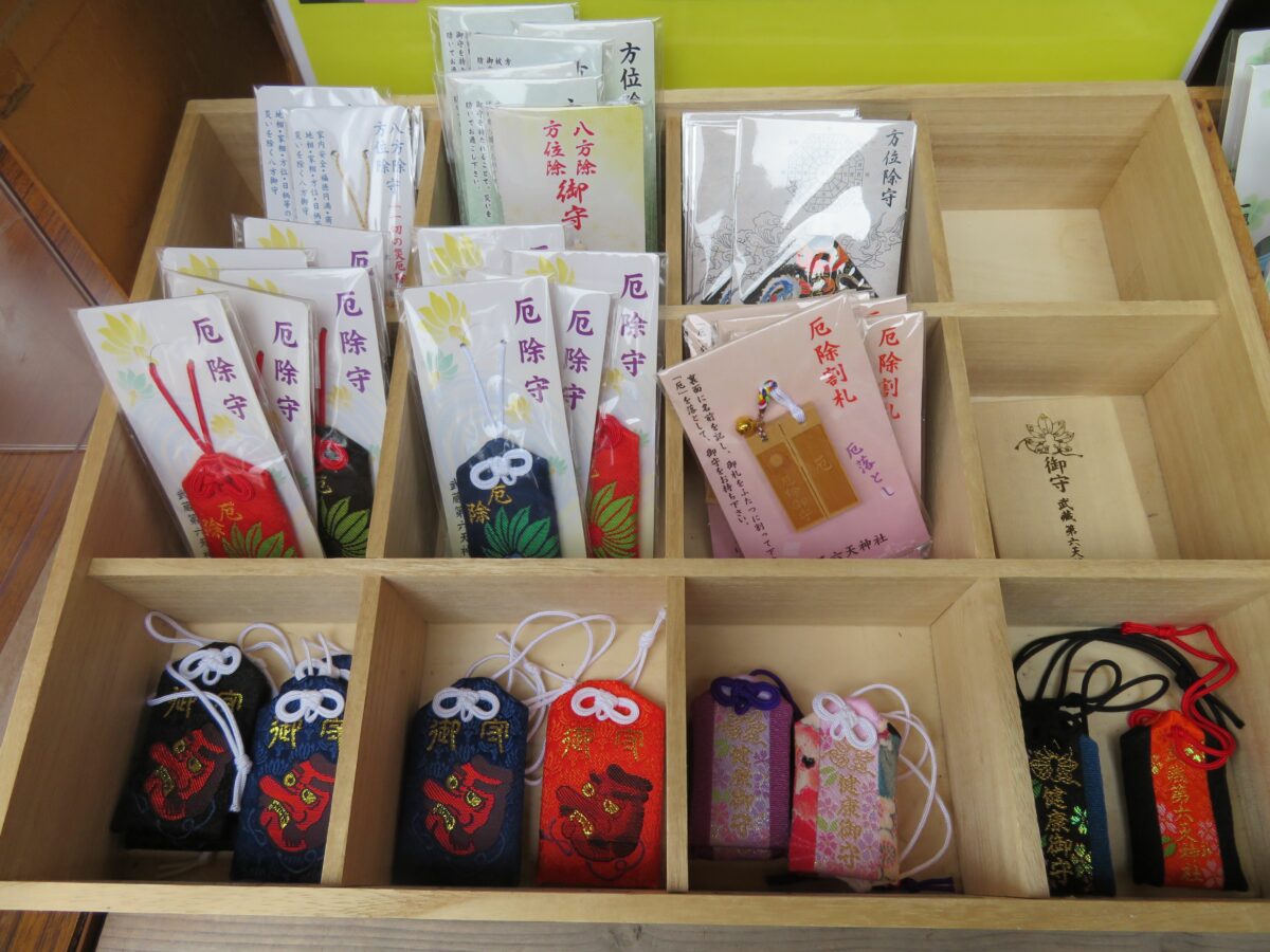 武蔵第六天神社では、拝殿の南に隣接する社務所で御朱印を頂くことができます。窓口にはお守りなど多種理の授与品が並んでいます。