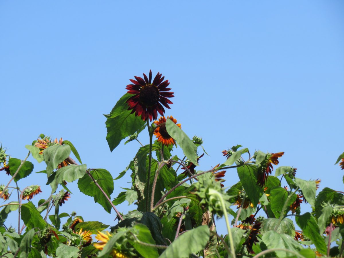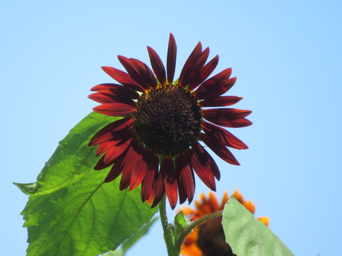 「ひまわりガーデン武蔵村山」で濃いワインレッドの花を咲かせるひまわり「クラレット」