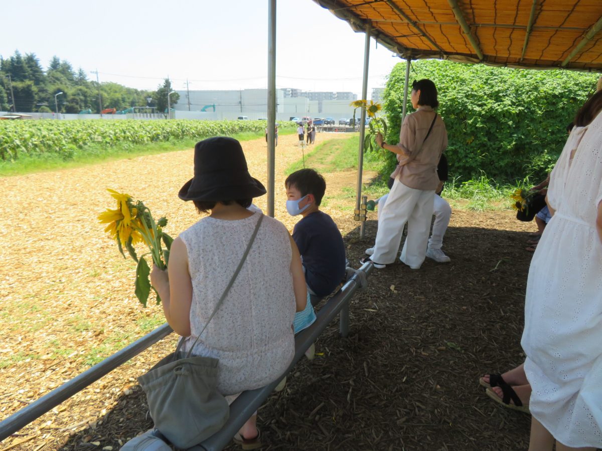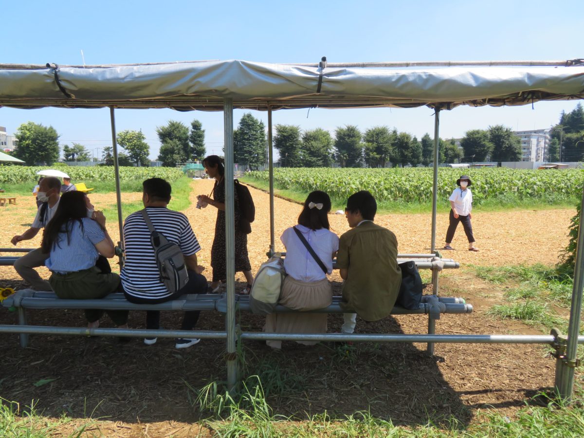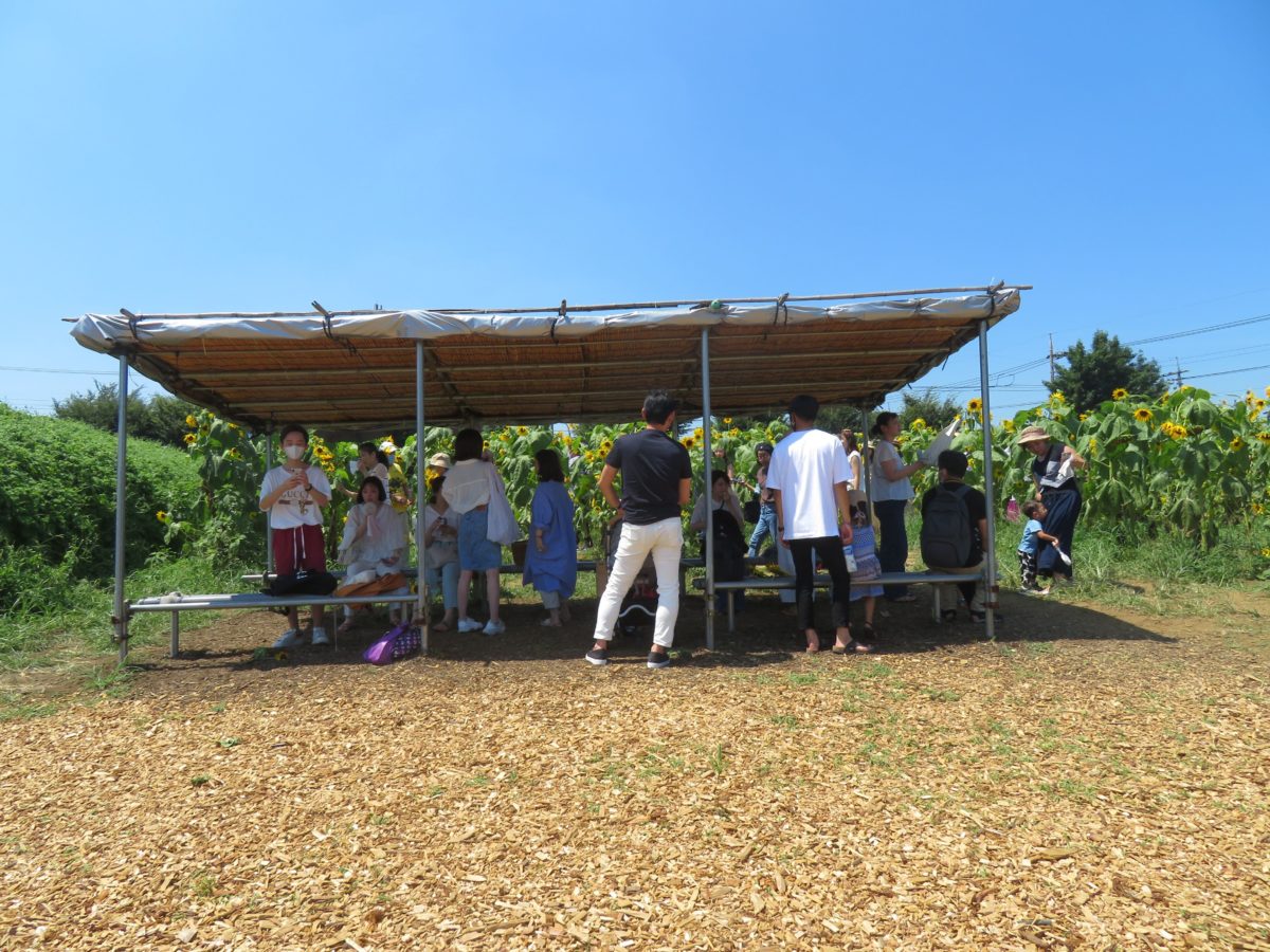 会場の中央には屋根つきの小屋、ベンチなどが設けられているので、厳しい太陽の陽射しを浴びることなく、ひまわりの花が作る絶景を眺めることができます。