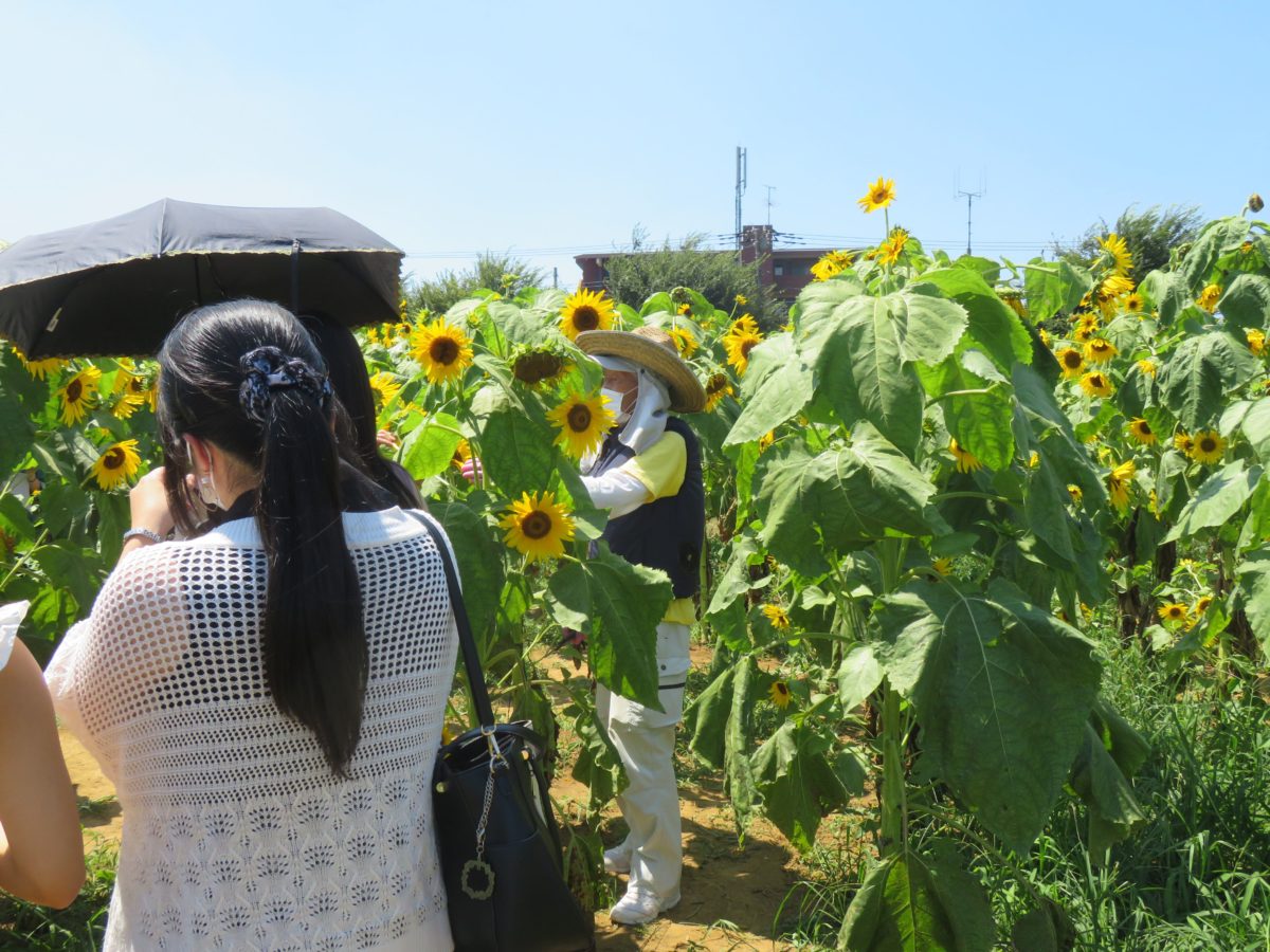 来園者の希望に応じてひまわりの花の摘み取りを行うスタッフ