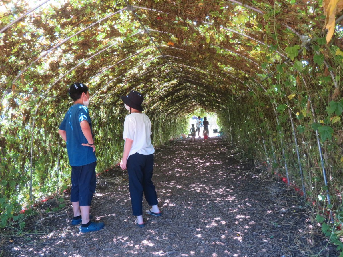 屋根つきの小屋に接するようにゴーヤのトンネルが作られているので、日陰に入って涼をとることができます。