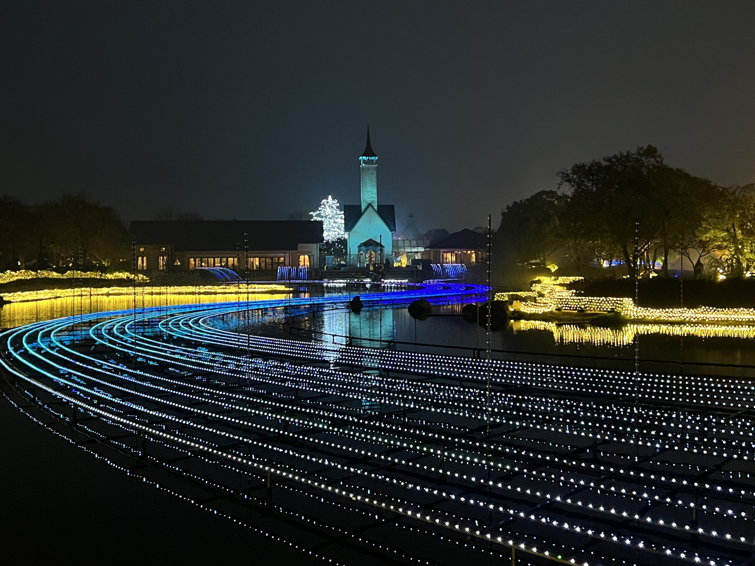 そしてチャペルの前からは流線形の流れるようなイルミネーションが。これは、木曽三川の流れを表しているのだそう。