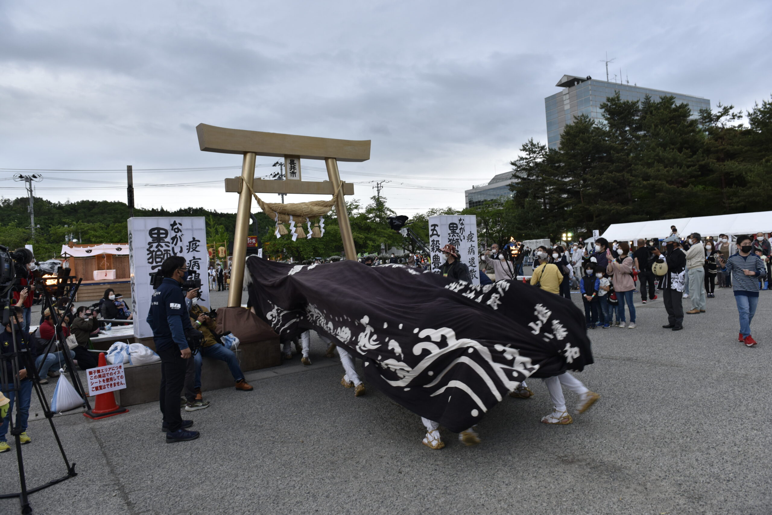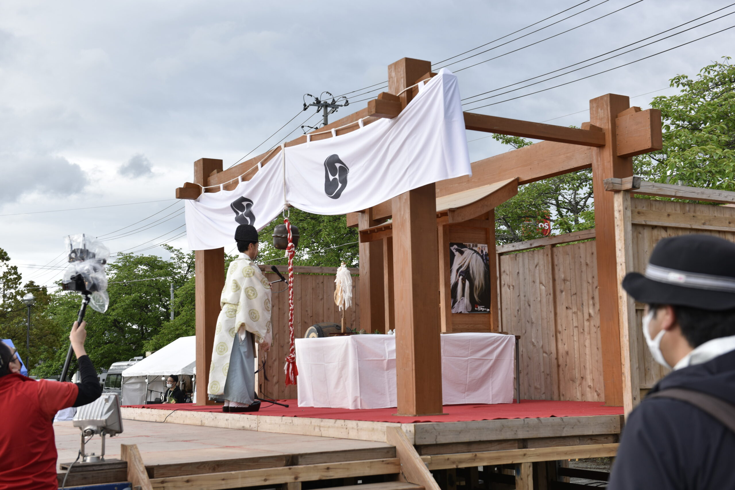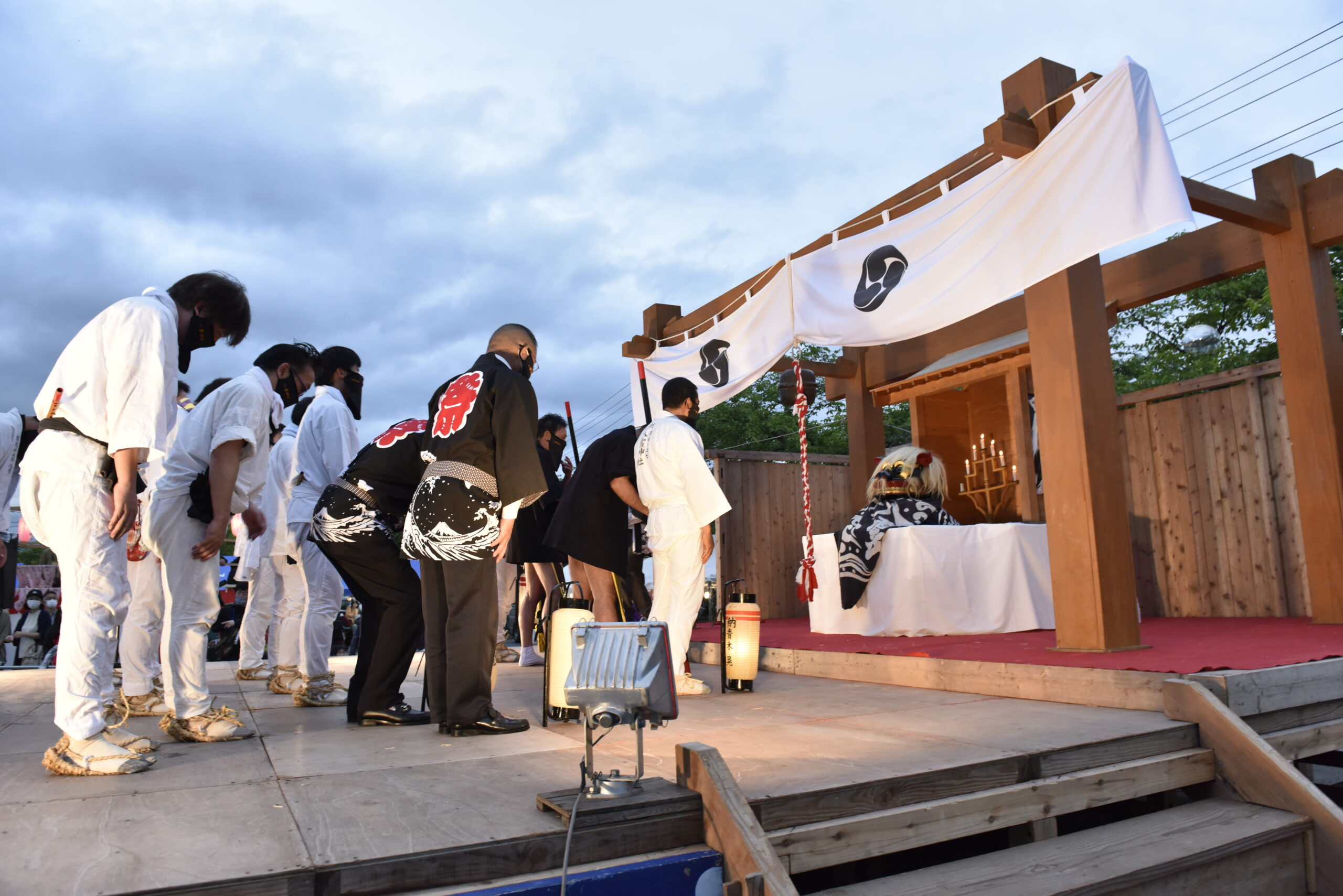 今回は、新型コロナウイルス対策のため、事前申し込みを受け付け、第1部から第3部まで入れ替え制で入場者数を制限して実施された。祭りは17:00より開始。あたりが薄暗くなる中で、お祓いや玉串奉奠(たまぐしほうてん)、市長さんの挨拶などが行われた。