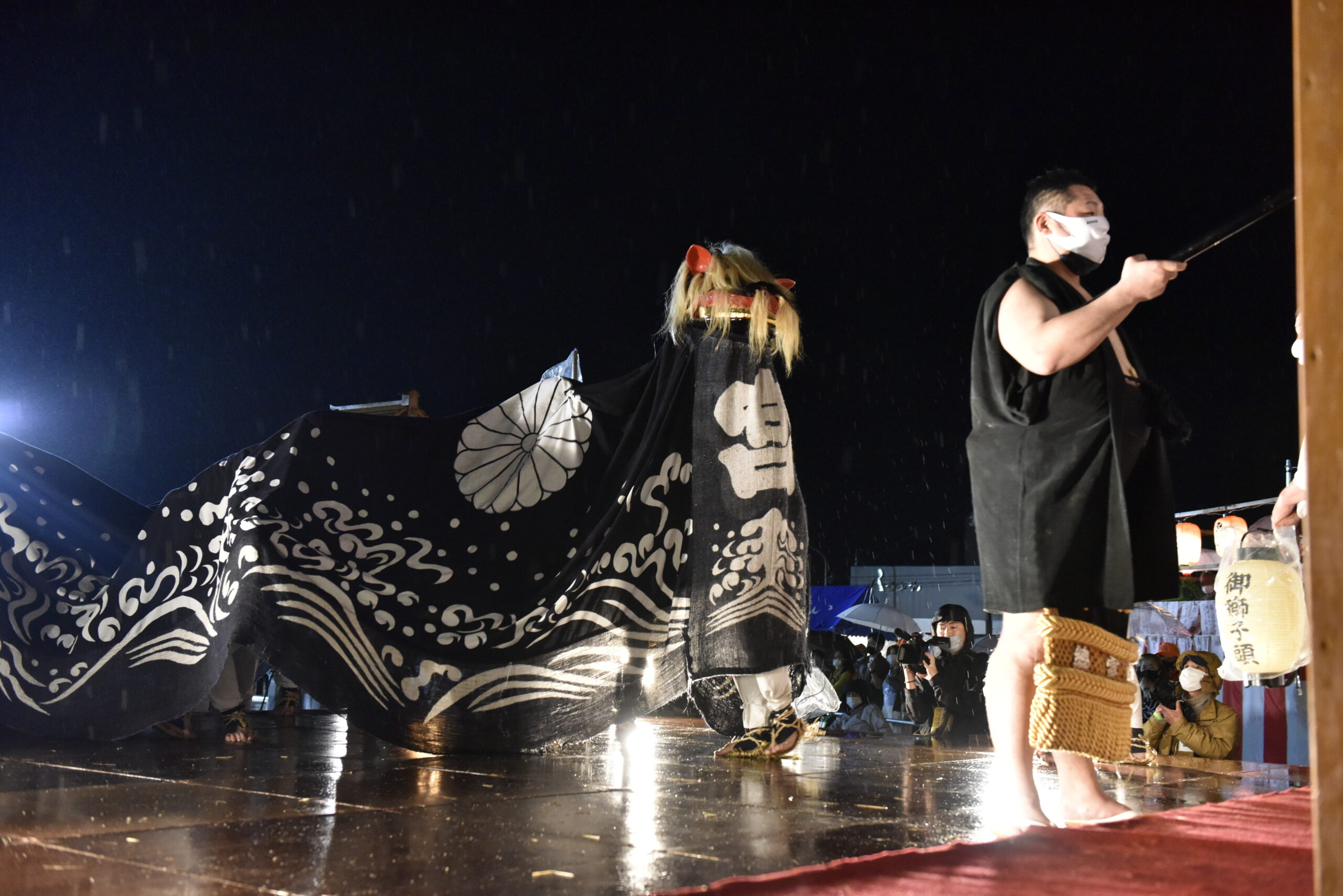 雨が降ってきたので、途中で合羽が配布されながらも雨天決行。水神様の性格通り、地域では黒獅子が来ると雨が降ると言われているようだ。この2つの獅子は終わり方が独特で、ゆっくりと幕を引きずるように、そして後ろを振り返りながら遊び足りないという様子で神社にはいっていった。