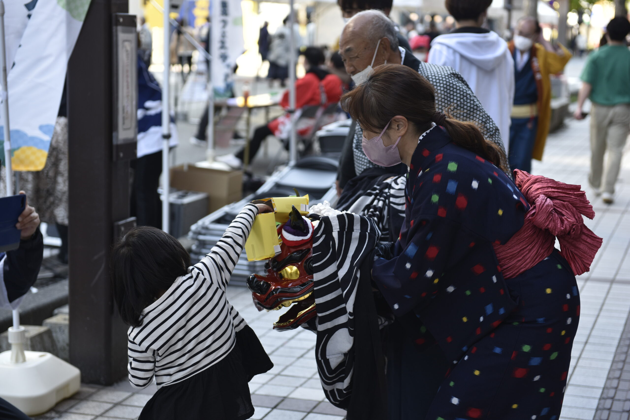 また、演舞だけでなく、子供達が獅子舞を楽しめる工夫も見られた。こちらは道端にあった「お獅子工房」のテントである。ここでは子供向けの獅子頭工作が行われており、作り方は行政の職員の方々が教えているらしい。