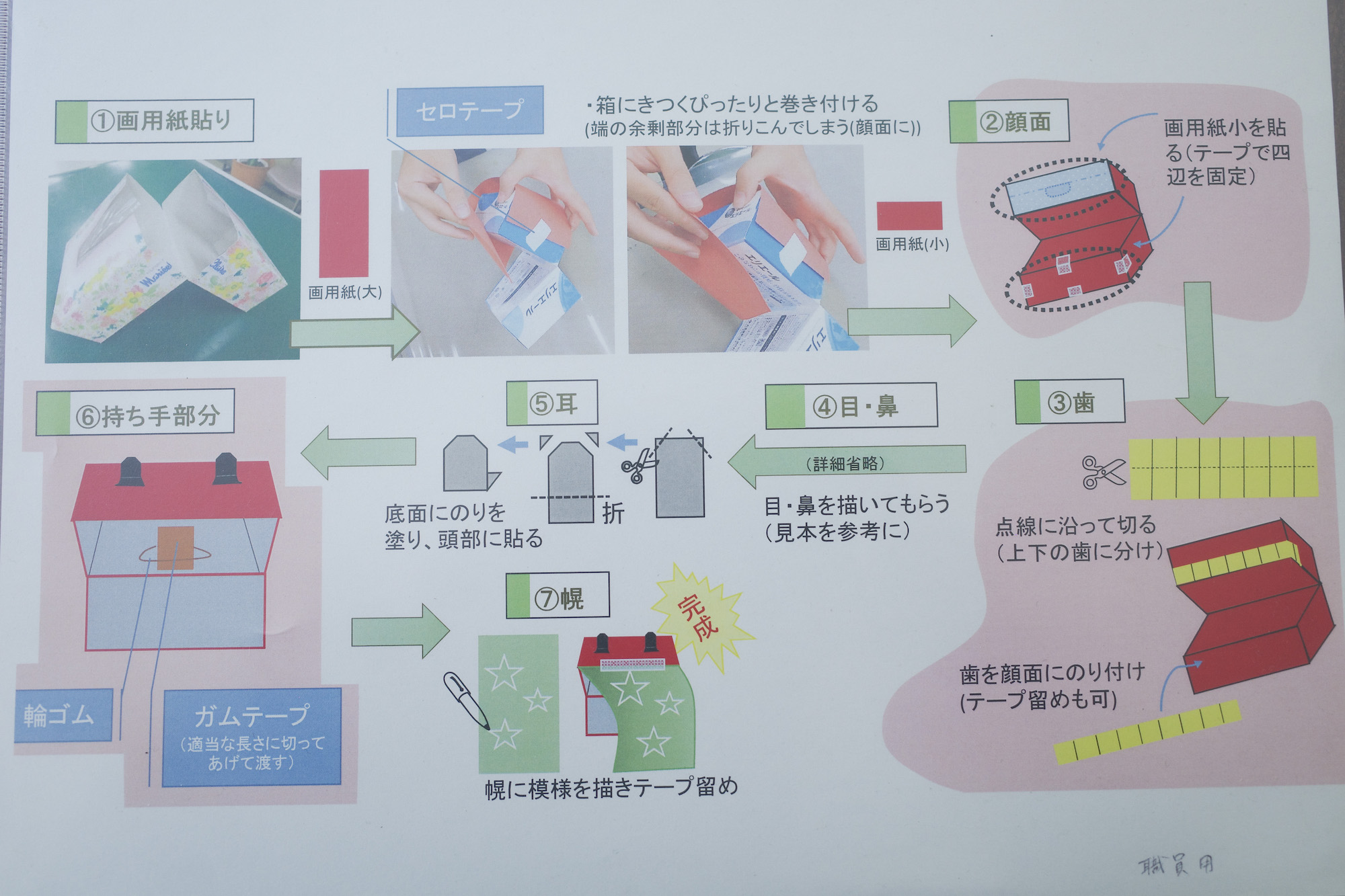 作り方はとてもシンプルで、ティッシュケースを切ったものにお気に入りの色の画用紙を貼る、歯を付ける、目や鼻を描く、耳を貼る、持ち手をつける、胴幕(幌)をつけるという手順だった。自分の家でも揃えられそうなものばかりで、丈夫さはともかく手軽に作れるのが良いと感じた。
