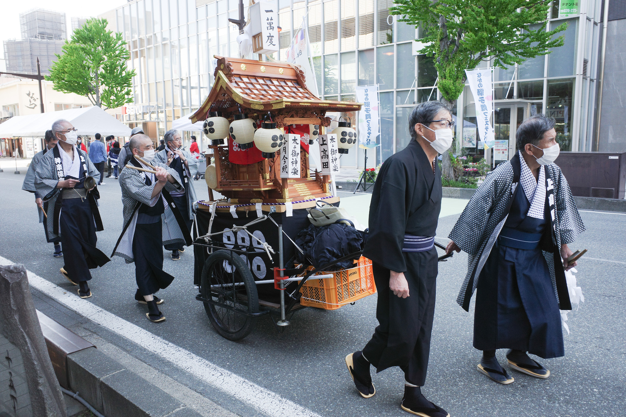 屋台には太鼓を叩く人、笛を吹く人、鉦を鳴らす人など様々な人が付いて歩いていることがわかる。また、それぞれの屋台や法被のデザインの違いも見られて面白い。日本全国の獅子舞を見渡せば、屋台が付かず太鼓が独立して運ばれるということも多い。屋台が登場することがこの地域の獅子舞の大きな特色になっているように思えた。
