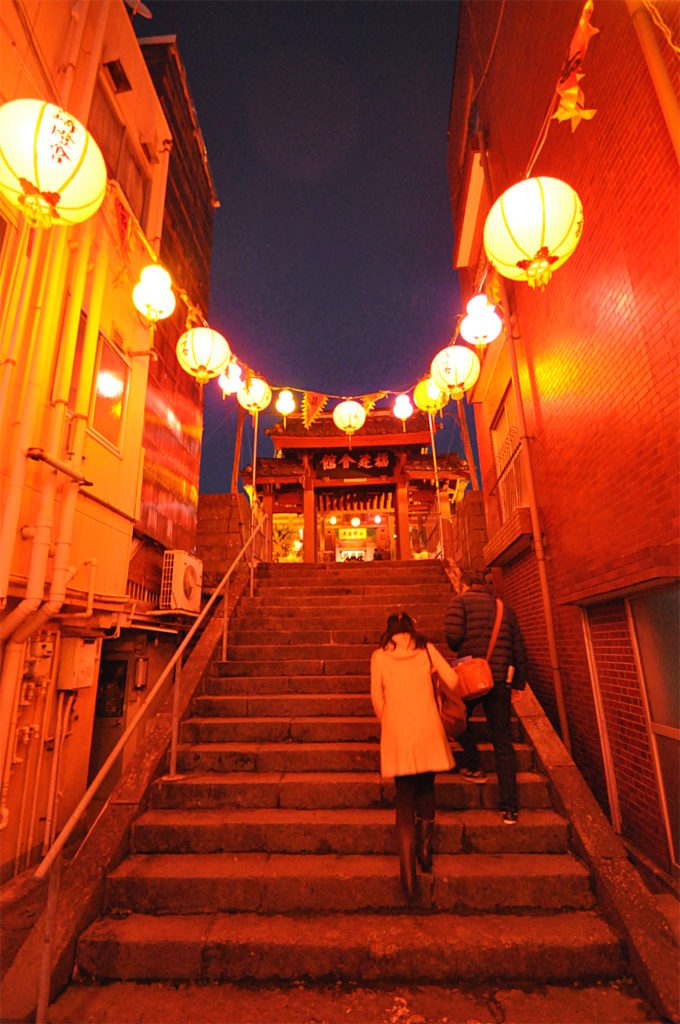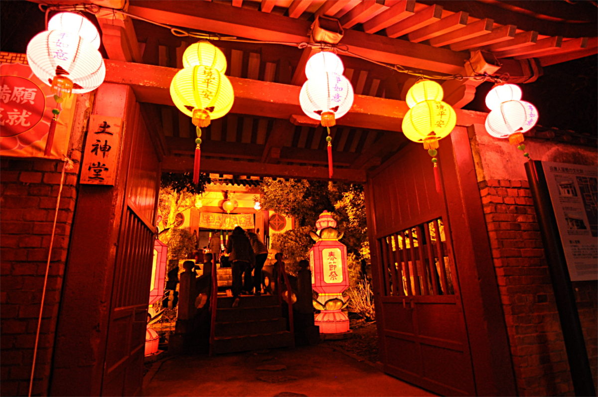 かつて貿易のために中国から来た方たちが生活していた場所「唐人屋敷」のエリアでは、「ロウソク祈願四堂巡り」というイベントが開催されています。他の会場のような賑やかさとは真反対、往時の面影を残す町並みをやさしくランタンの灯が照らしだし、とても情緒的な雰囲気の会場です。新地中華街会場からは約10分程度歩いた場所にあります。
