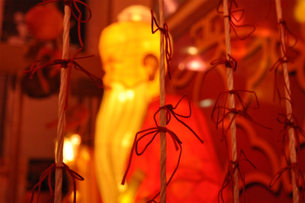 通りには縁結びの神「月下老人」のオブジェが設置され、長崎ランタンフェスティバル特製の「赤い糸のお守り」が販売されています。復路の中に入っている2本の赤い糸の、片方をお守りとして持ち、もう片方を願いを込めて結びつけるのだそうです。