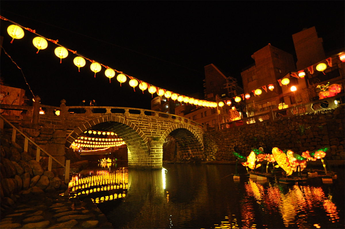 新地中華街会場から15分ほど歩いたところ、長崎市の有名観光スポット「眼鏡橋」周辺の中島川沿いの会場です。赤く光るランタンが目立つランタンフェスティバルですが、ここの会場は黄色いランタン。川面に映るランタンと眼鏡橋の両方を見ることができるスポットです。
