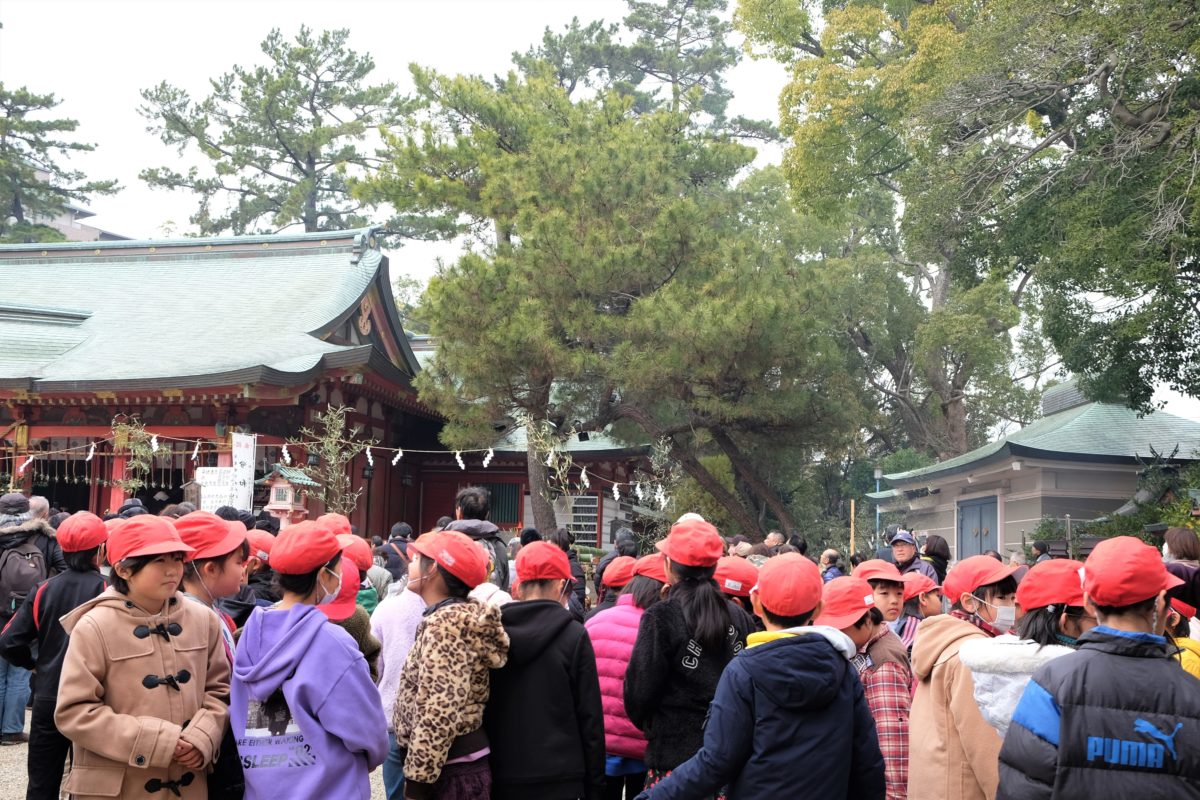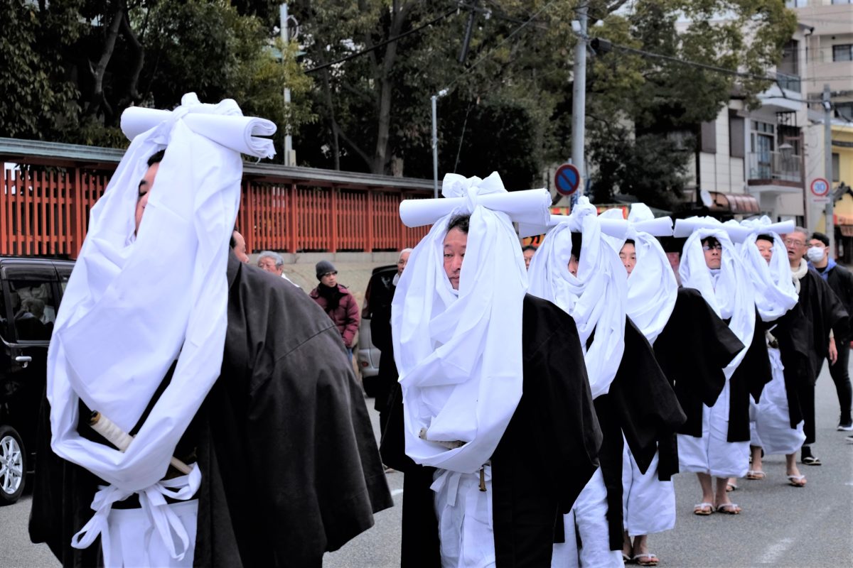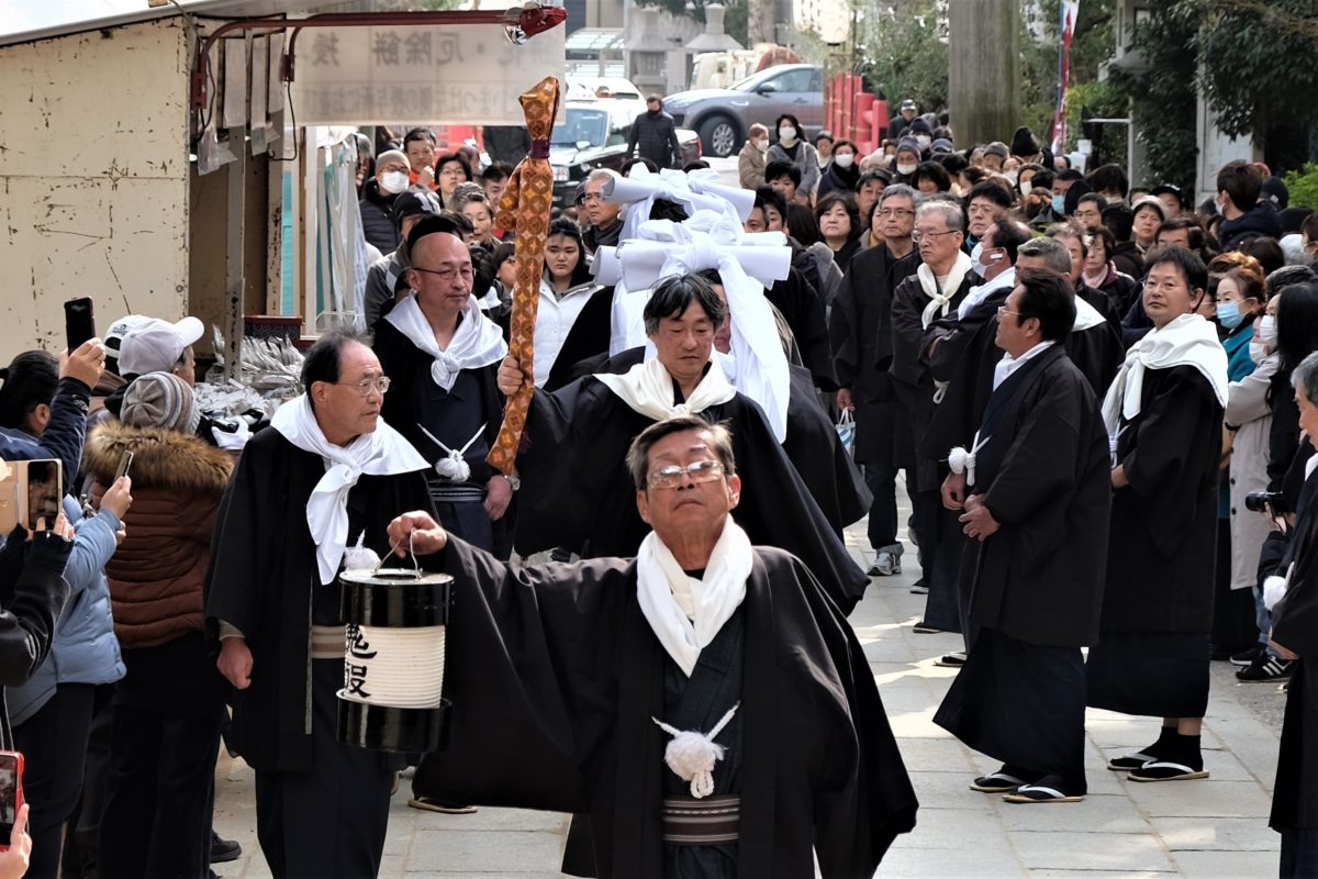 また「鬼役の彼は今回で10回目の大ベテラン!」と奉仕回数をコメントすると、鬼役が前日に何度も井戸水をかぶり、当日は早朝に須磨海岸で海中に入り、身も心も清めていることをご存じの参拝者たちの「ご苦労様!」「ありがとう!」と声援が飛び交います。神事というよりも雰囲気はまるでオマツリ。