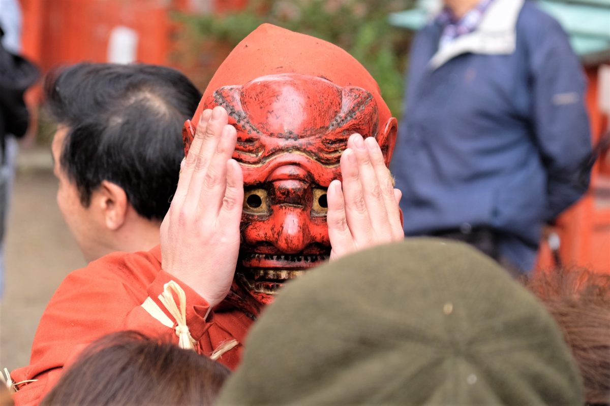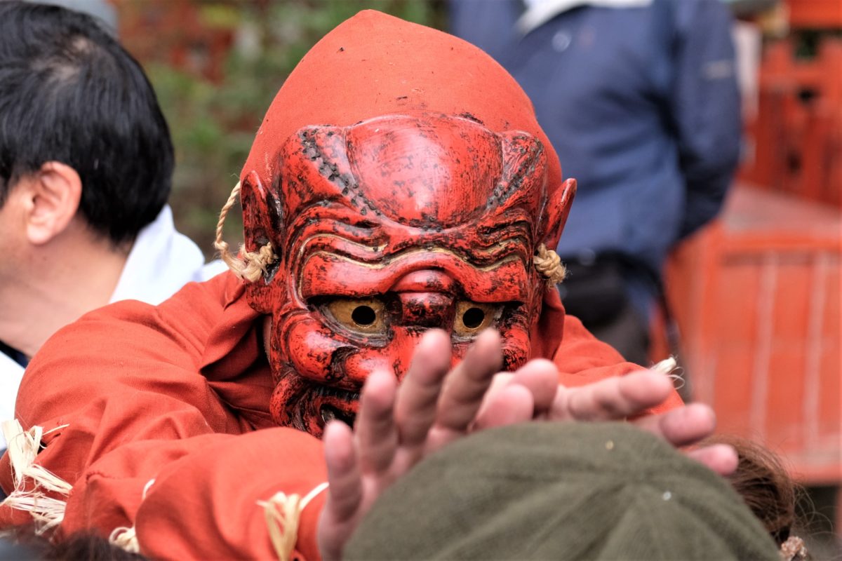 行事の間には厄除のため、鬼が自らの面を手で触ってはその手を参拝者の頭や顔に乗せくれます。かなり混み合いますが、そのポイントは舞台向かって右側最前列です。