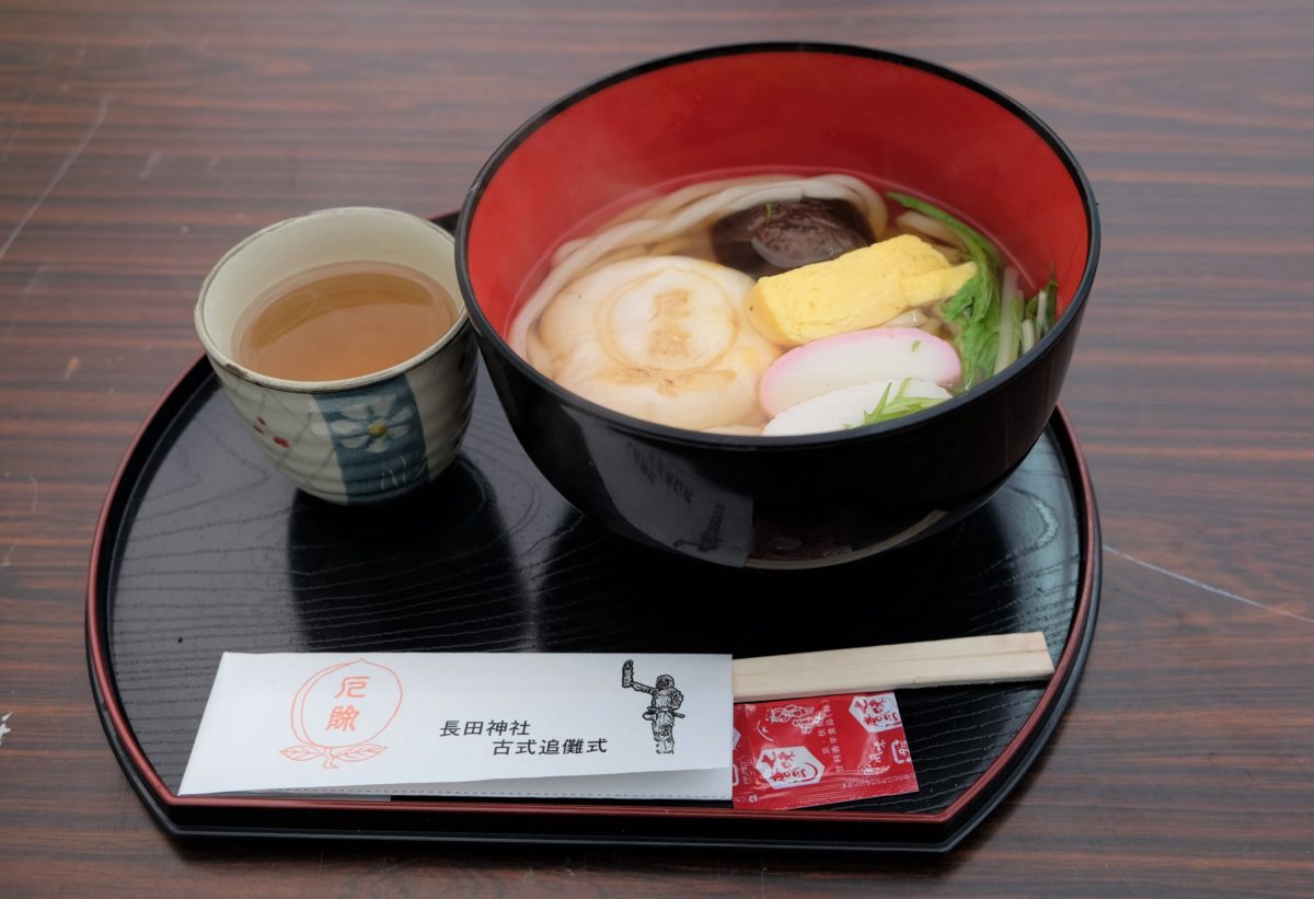 行事は長丁場で寒いので、特設の出店で腹ごしらえしときましょう。鬼がついたという「厄除け餅」と縁起物の五色の具が入った「厄除けうどん」でお腹一杯になります。