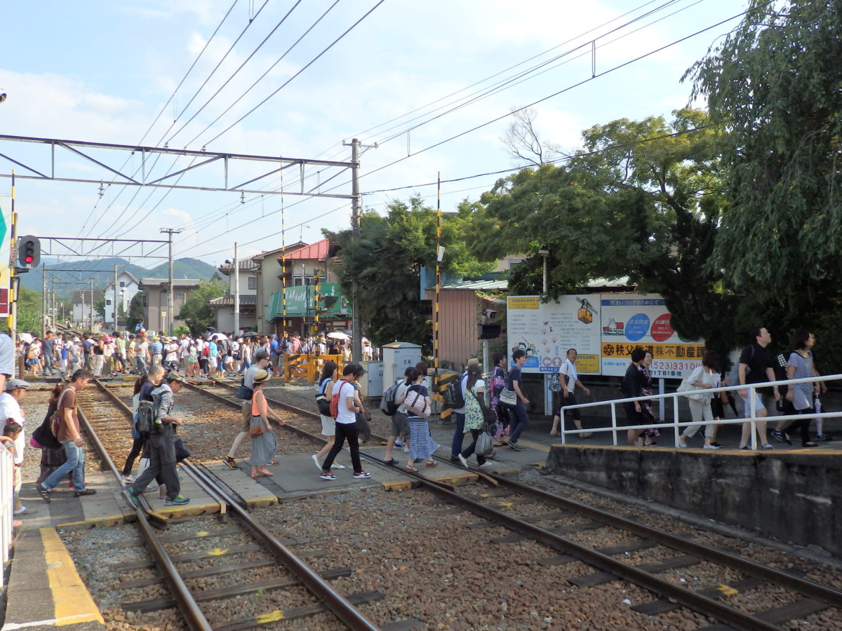 電車が到着する度に、大勢の人が押し出される長瀞駅