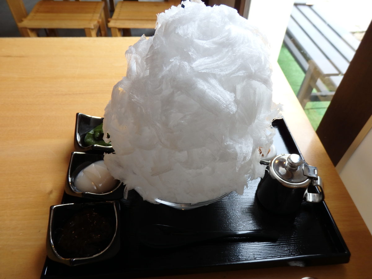 長瀞には、くるみだれそば、わらじかつ丼、豚みそ丼、鮎めしなどご当地グルメの種類も豊富ですが、暑い夏に最も人気があるのが、阿佐美冷蔵のかき氷です。阿佐美冷蔵は長瀞の西方に聳える宝登山の沢の一角に設けた氷池に伏流水を引き、自然の気候を利用して氷を作り続けています。宝登山神社の参道に直営のかき氷専門店を出していますが、「長瀞船玉まつり」の当日であれば4時間前後の待ち時間を覚悟する必要があります。でも、長瀞駅周辺には阿佐美冷蔵の天然氷を仕入れてかき氷を作る店が数多くあります。その中から空いている店を見つければ、短い時間で天然氷を味わうことができます。その際の目印は阿佐美冷蔵の暖簾です。幾つもの飲食店が店先に阿佐美冷蔵の暖簾をたなびかせています。ショッピングやグルメなどで長瀞の魅力に浸り、確保した場所に戻ります。