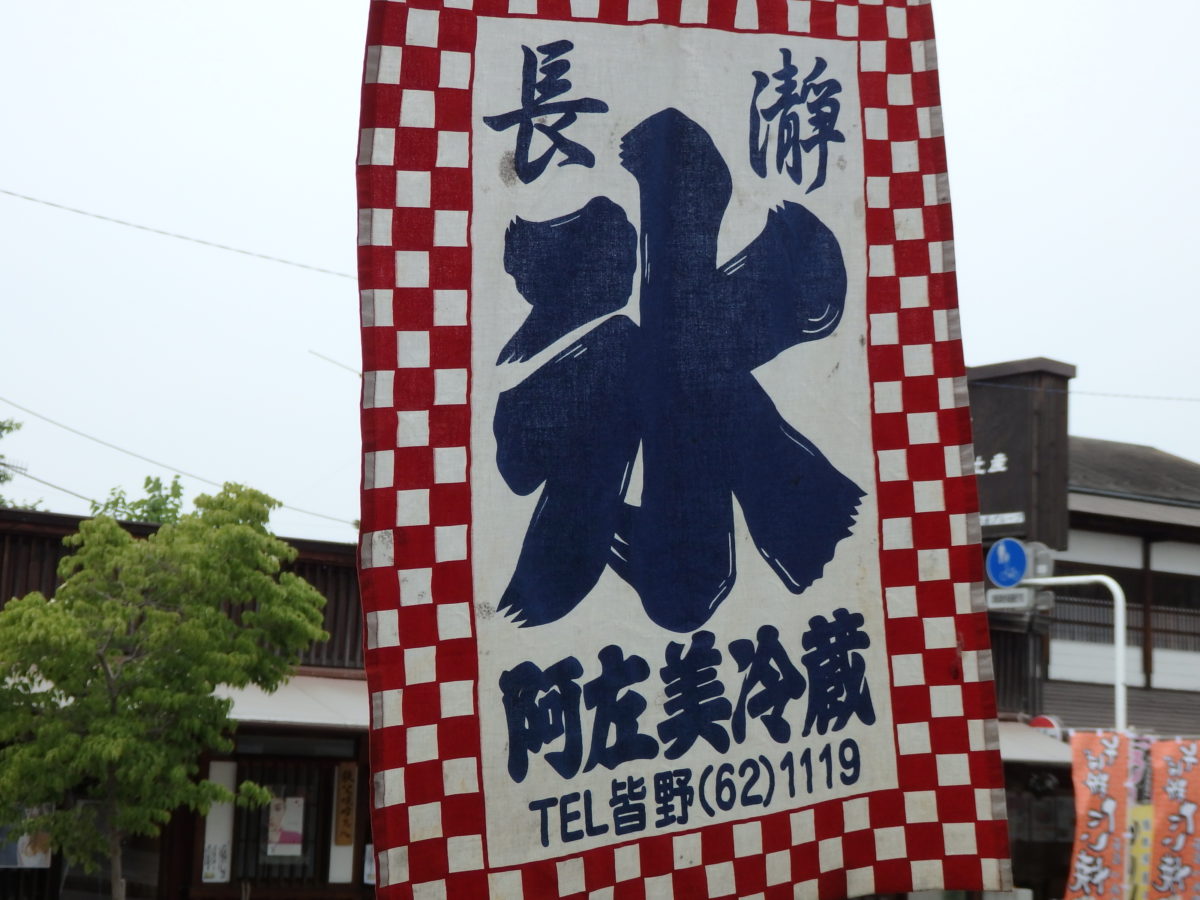 長瀞の飲食店の店先でたなびく阿佐美冷蔵の暖簾