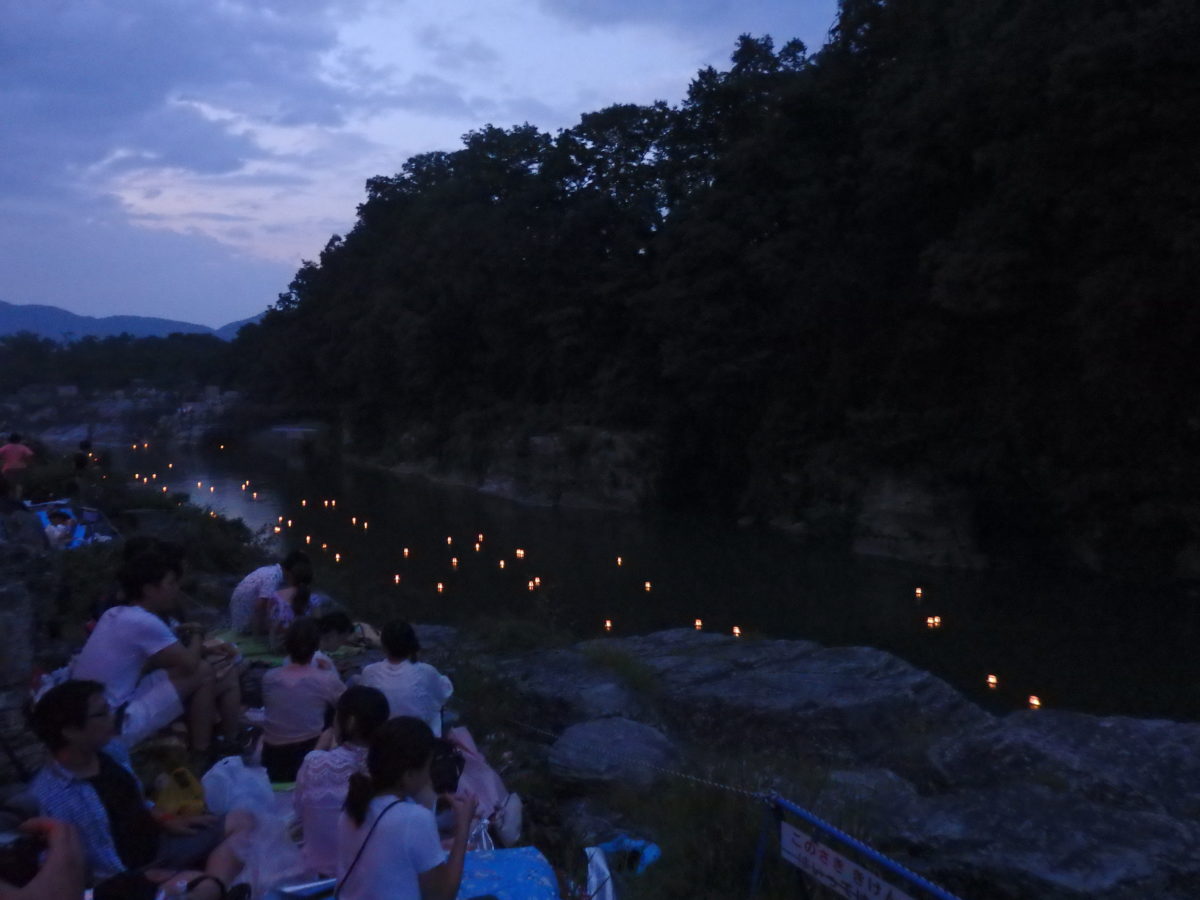 18:00に「水上安全修ばつ祭」が行われた後、1000基前後の灯篭が荒川に流されます。「長瀞船玉まつり」は明治時代の末、水神様を祀り、水上安全と水難供養を行ったことを起源としています。「船玉まつり」の名は、船の安全を祈願して祀る船霊に由来しているのです。川の流れに乗って列をなす灯籠で、水の犠牲になった人々の供養を行っているのです。太陽が沈み暗くなると灯篭の灯りが川面にたなびき、とても幻想的な光景となります。