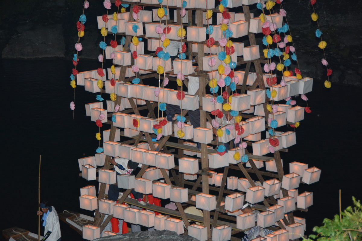 「長瀞船玉まつり」は、17:00の「万灯船の運航」で始まります。万灯船は普段はライン下りの船として利用されている船体をベースに、長瀞の1日限りの船大工が作っています。伝統の技を巧みに利用し、400を超える提灯がバランスを失うことなく高々と組み上げられています。