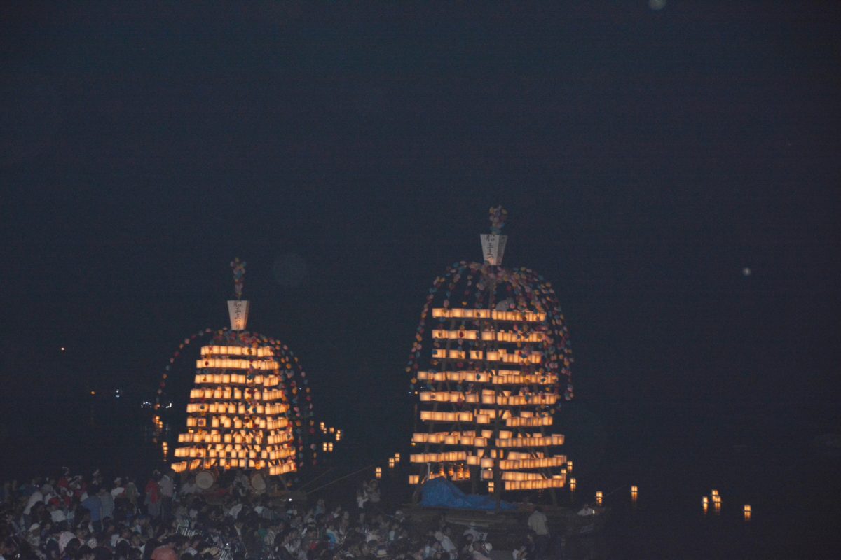 灯篭流しが行われる頃には、万灯船の提灯に灯が燈されます。灯篭の列を縫うように、柔らかな光を放ちながら万灯船が運航されます。灯篭と万灯船の光の帯が夢幻の空間を作り上げているようです。温かな和の情緒に包まれます。