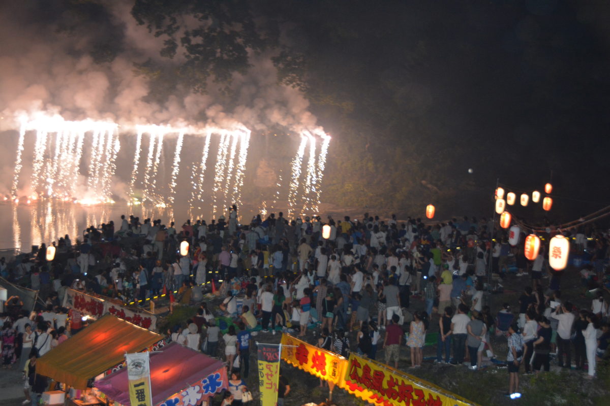 静かな空間にアクセントを加えるのが花火大会です。19:15と20:00の2回に分けて行われます。仄かな灯りが川面を照らす空間の雰囲気が、たちどころに変化するのです。尺玉、スターマイン、仕掛花火、ミュージック花火、メッセージ花火など約3500発の花火が、轟音とともに長瀞の夜空を華麗に彩ります。20:45頃に「ナイアガラの滝」がまばゆく長瀞を照らしフィナーレとなります。