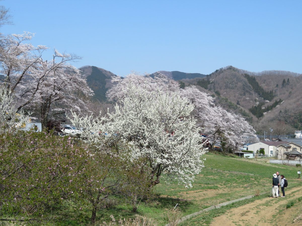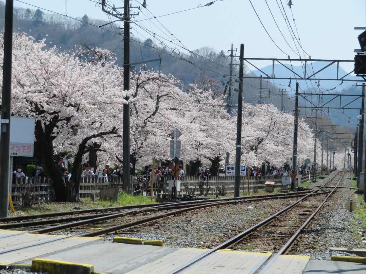 北と南の桜通りが桜のトンネルに変身する頃には、長瀞駅の東西に育つ桜も満開となります。長瀞駅の西方には宝登山が聳えています。駅舎から山麓の宝登山神社への参道の左右も薄紅色の桜で彩られます。参道の南の野土山も桜の花で覆われます。また長瀞駅の東方には荒川が流れ、その東岸に広がる井戸地区の桜並木も見逃せないでしょう。