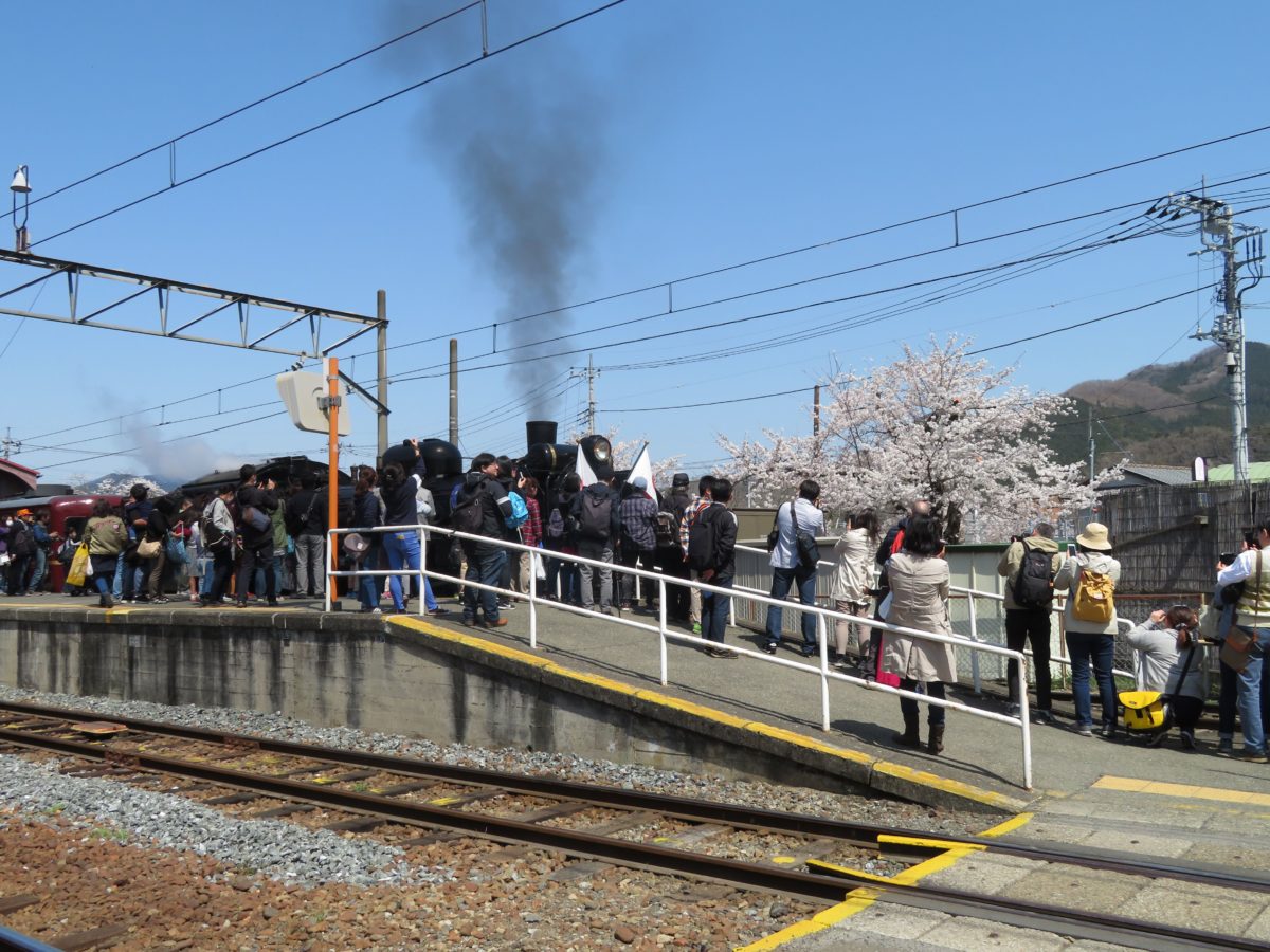 桜の花に囲まれる秩父鉄道の長瀞駅