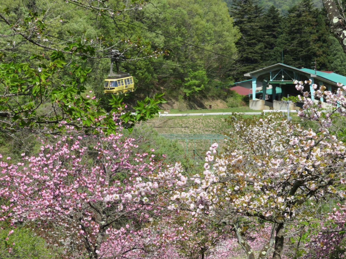「長瀞桜まつり」の期間中で最も多くの人々が訪れるのは長瀞駅周辺が桜の園となる時期ですが、出遅れてしまった人を救ってくれるのが、宝登山麓の不動寺近くの通り抜けの桜です。このエリアのヤエザクラが、見頃となるのは例年4月中旬から下旬です。宝登山ロープウェイの山麓駅にも近く、桜の花の間をゴンドラが上下します。