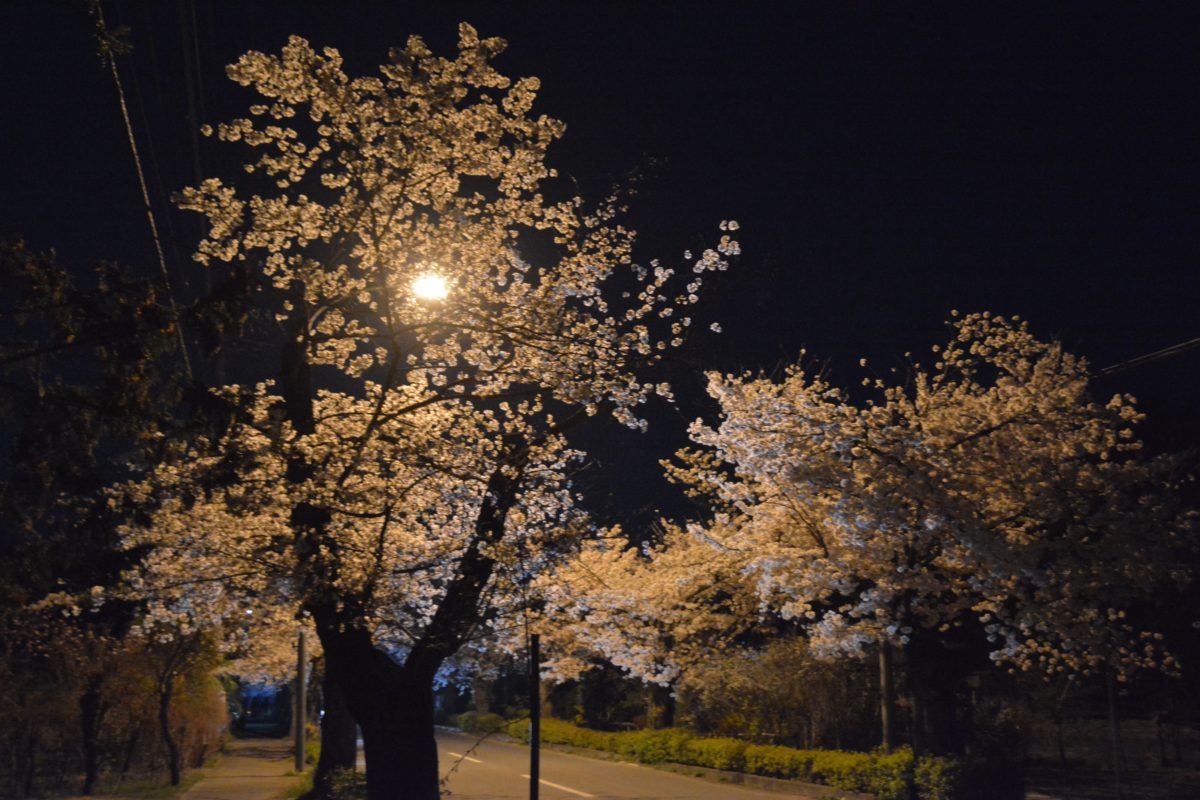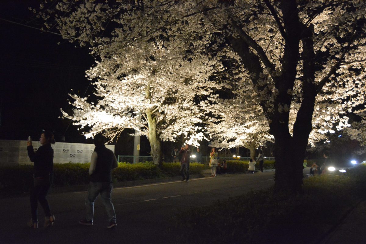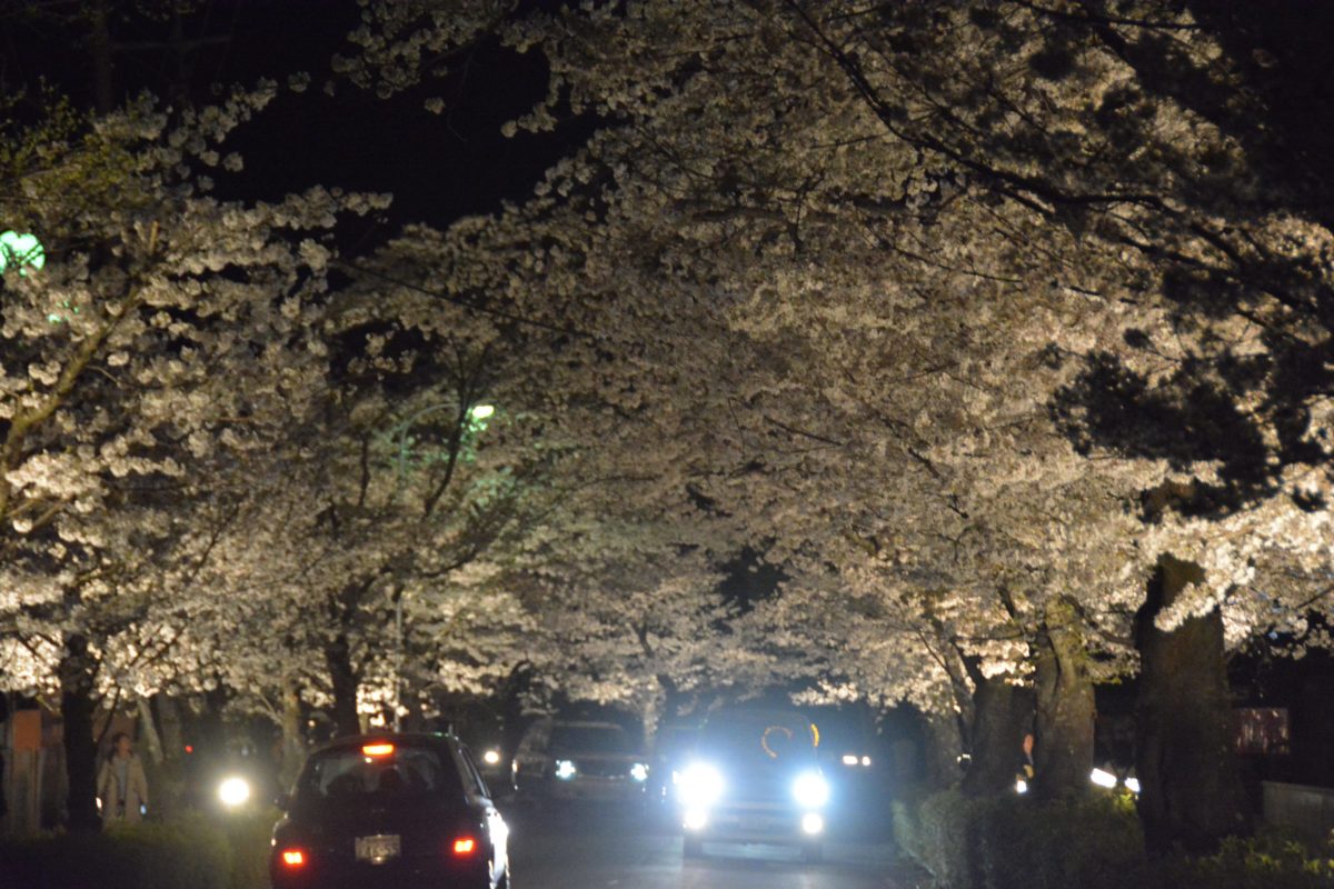 夜間にライトアップされる北桜通りの桜並木
