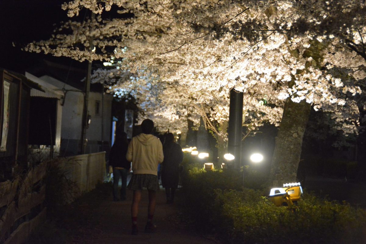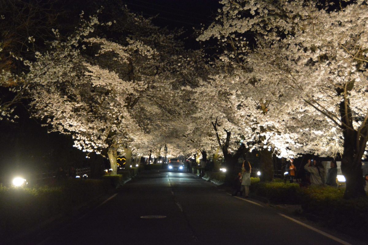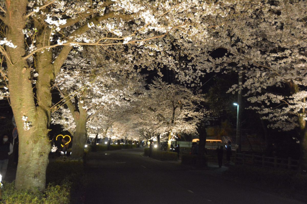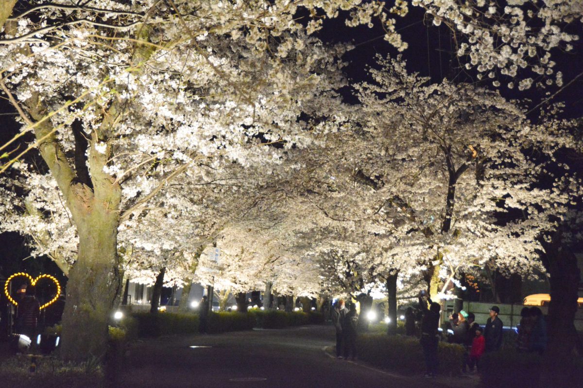 夜間にライトアップされる北桜通りの桜並木