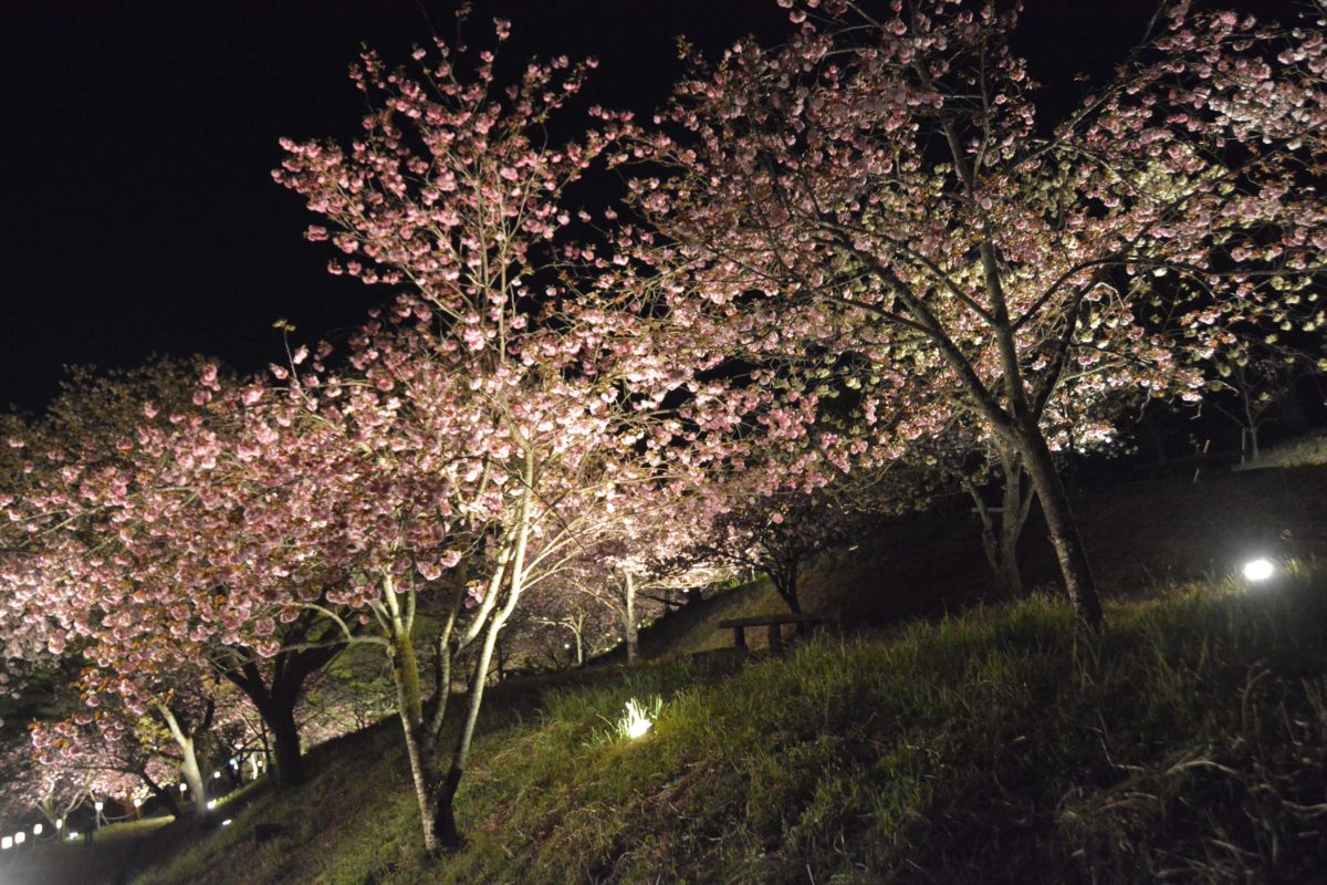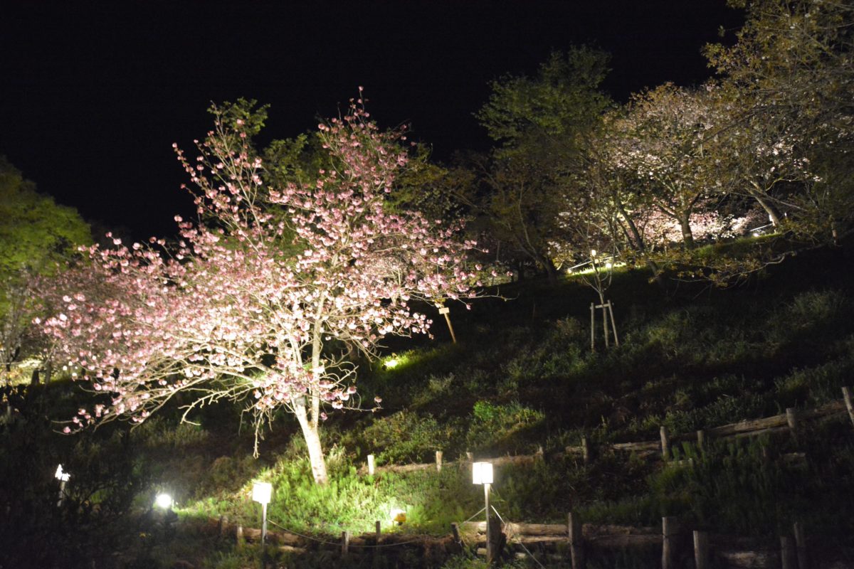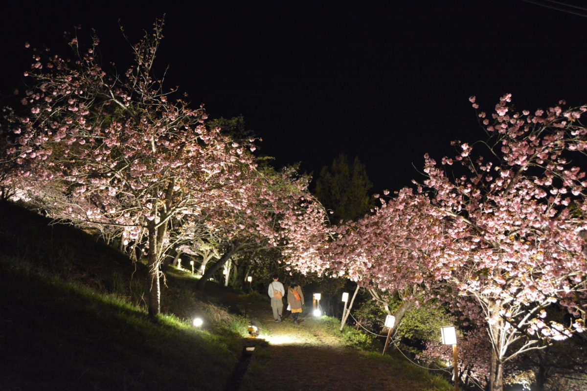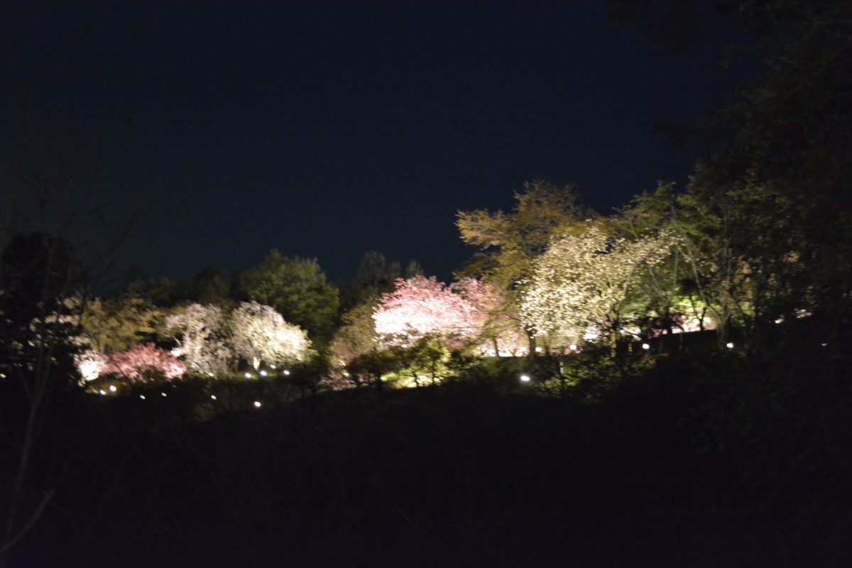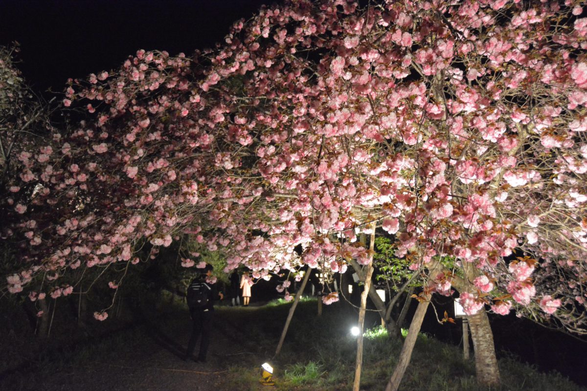 夜間にライトアップされる通り抜けの桜