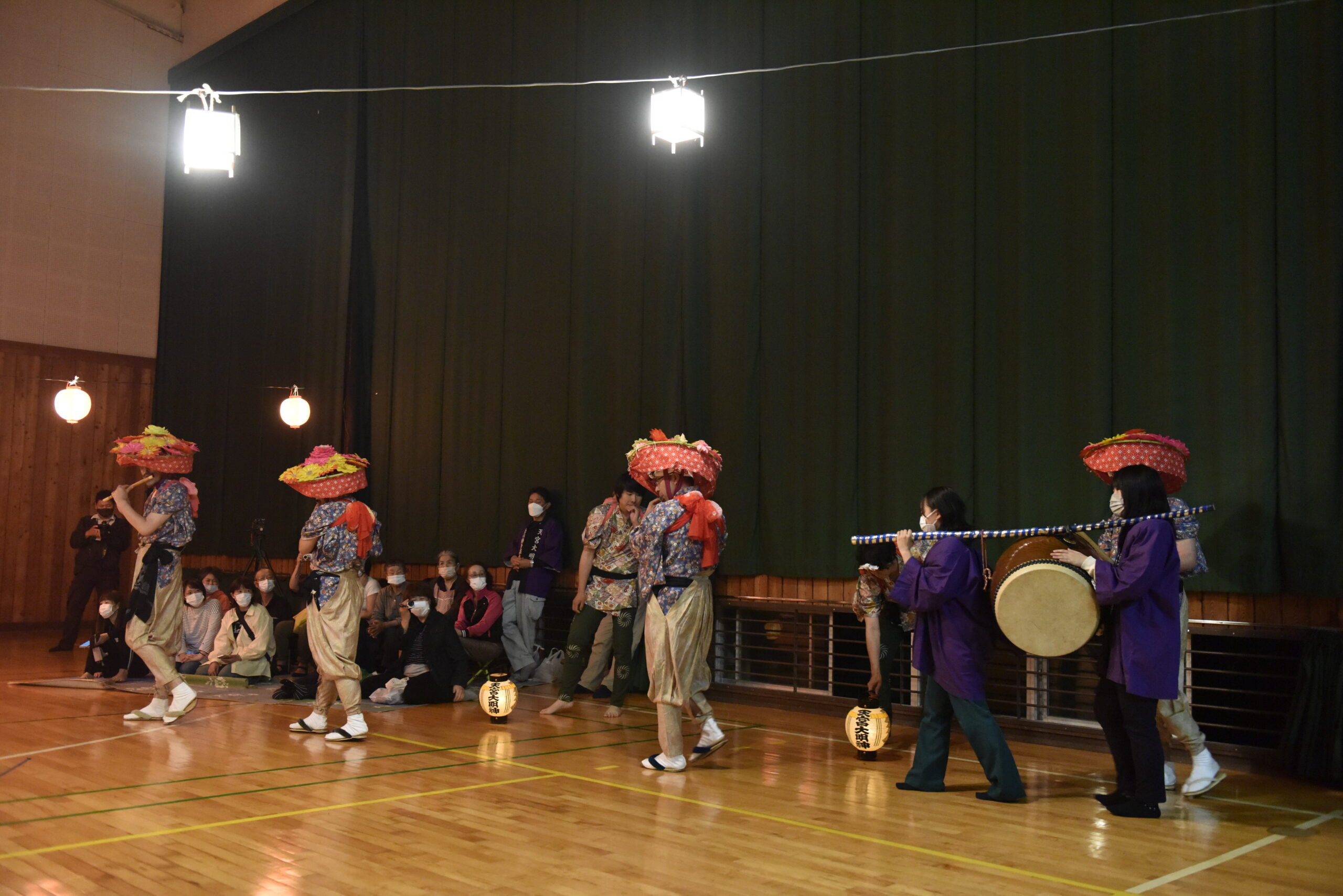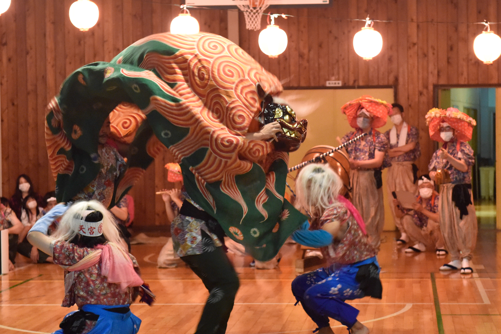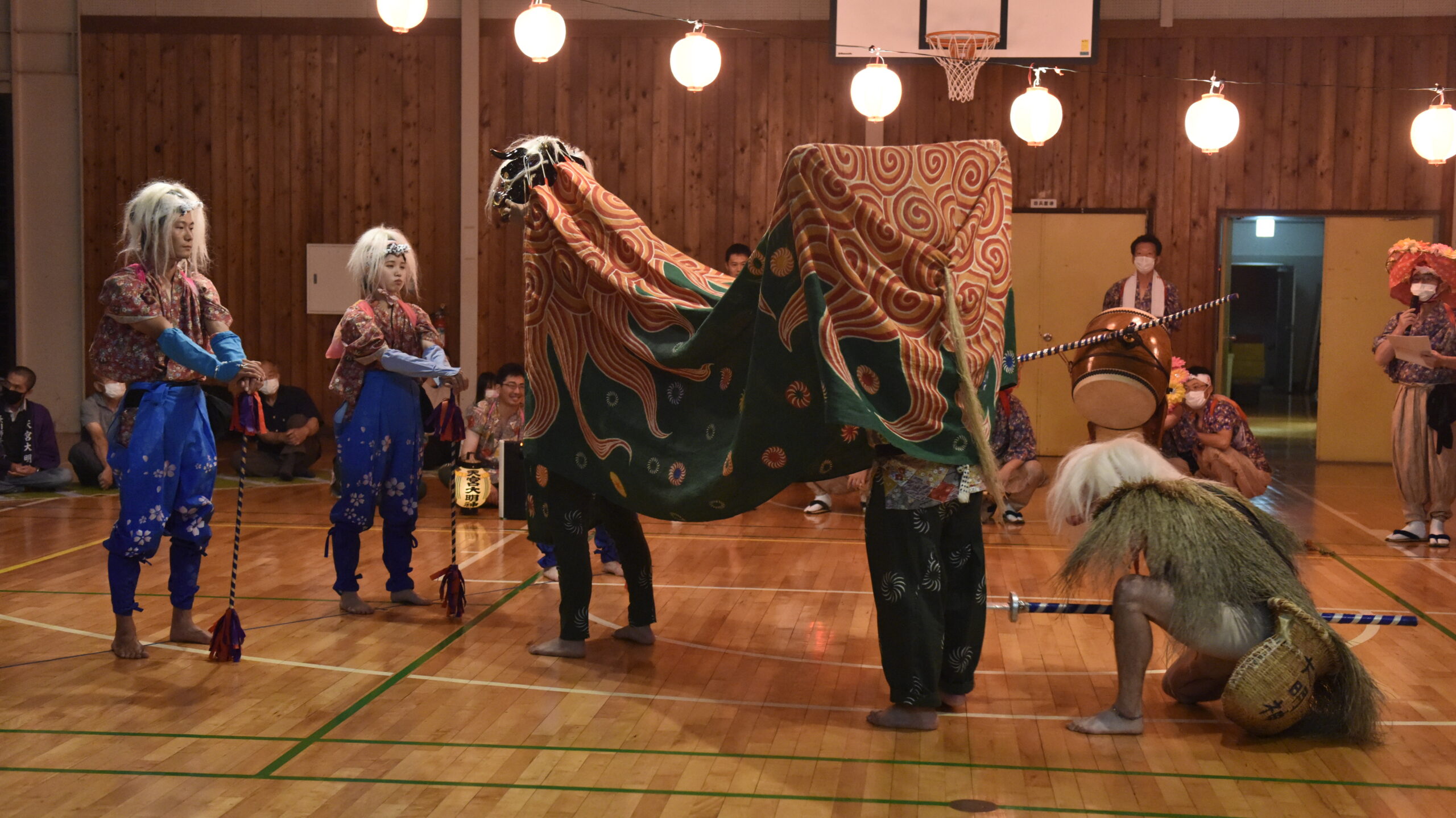 それでは、獅子舞を現地で拝見した様子を振り返っておきたい。当日は雨だったので、通常は外で開催するところを、天宮大明神の向かい側にある地域の体育館での開催へ変更となった。