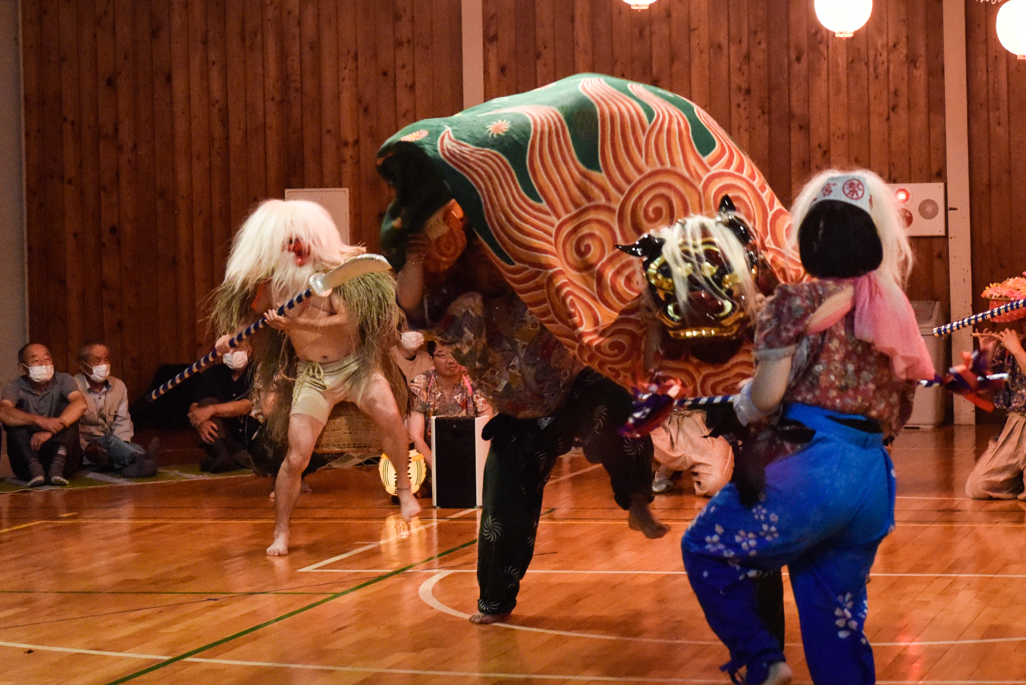 神事ののち、獅子舞は19時半に始まった。太鼓や笛の音とともに、獅子舞が会場に入場。入場と退場がしっかりあって、客席が設けられて獅子舞を見るという感じだったので、演劇的な要素も強い獅子舞だと感じた。