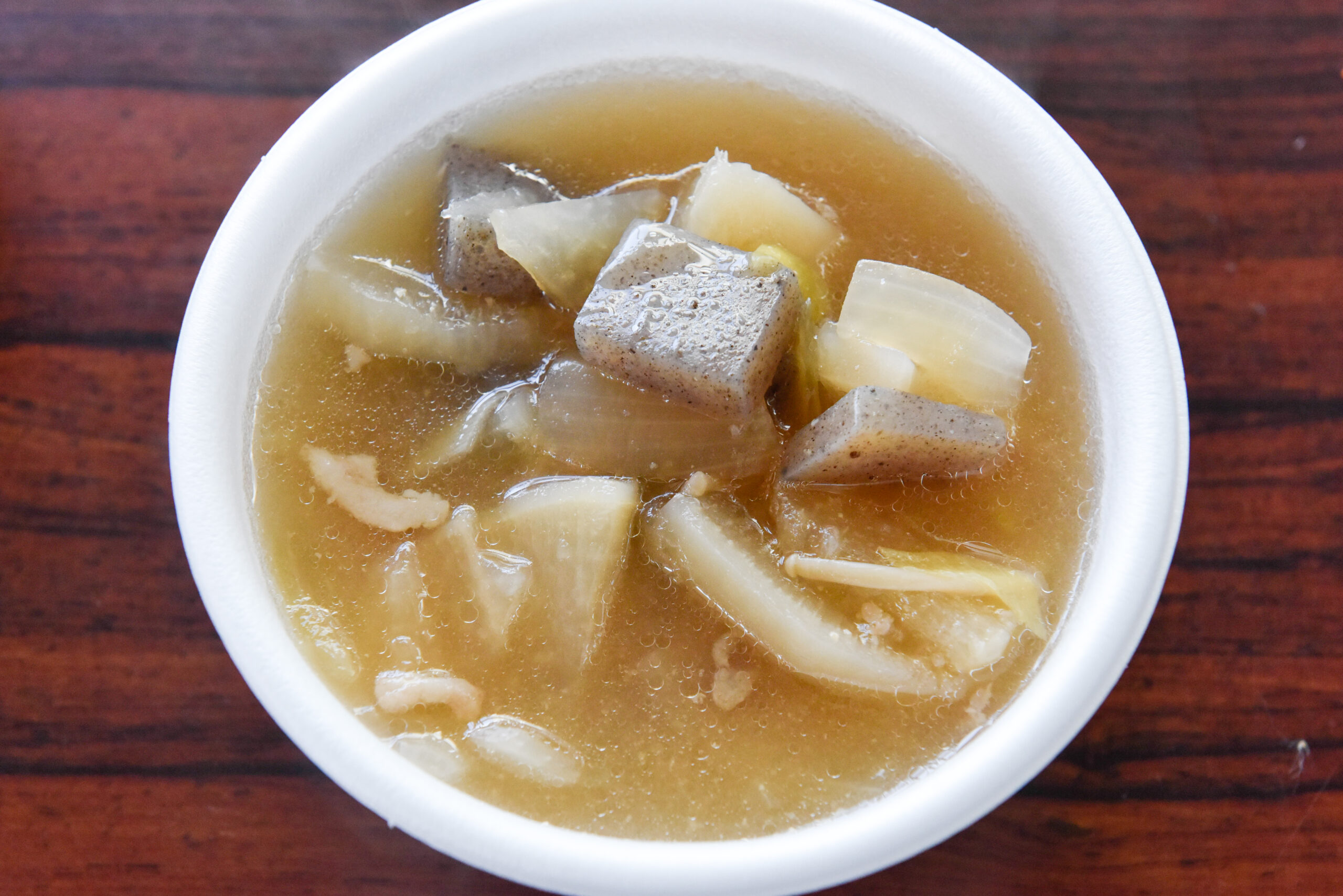 こちらは「ニク」あるいは「山の講汁」と呼ばれる豚汁のような郷土料理。通常、豚汁ならニンジンなども入っていますが、それらは見当たらず、また味噌ではなく醤油ベースで作られています。「山の講」という山の神様を祀る集まりで食べる食事だそうです。
