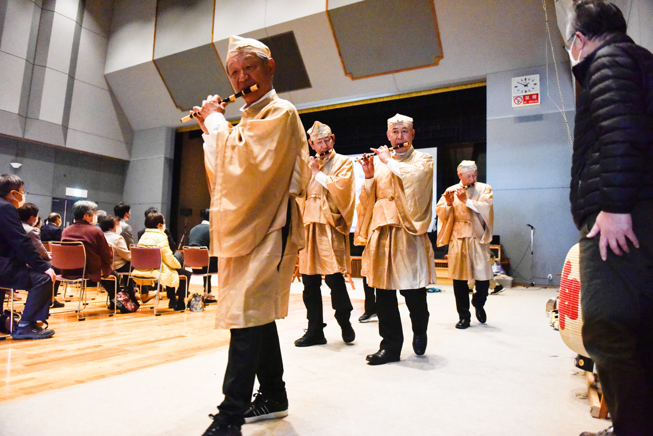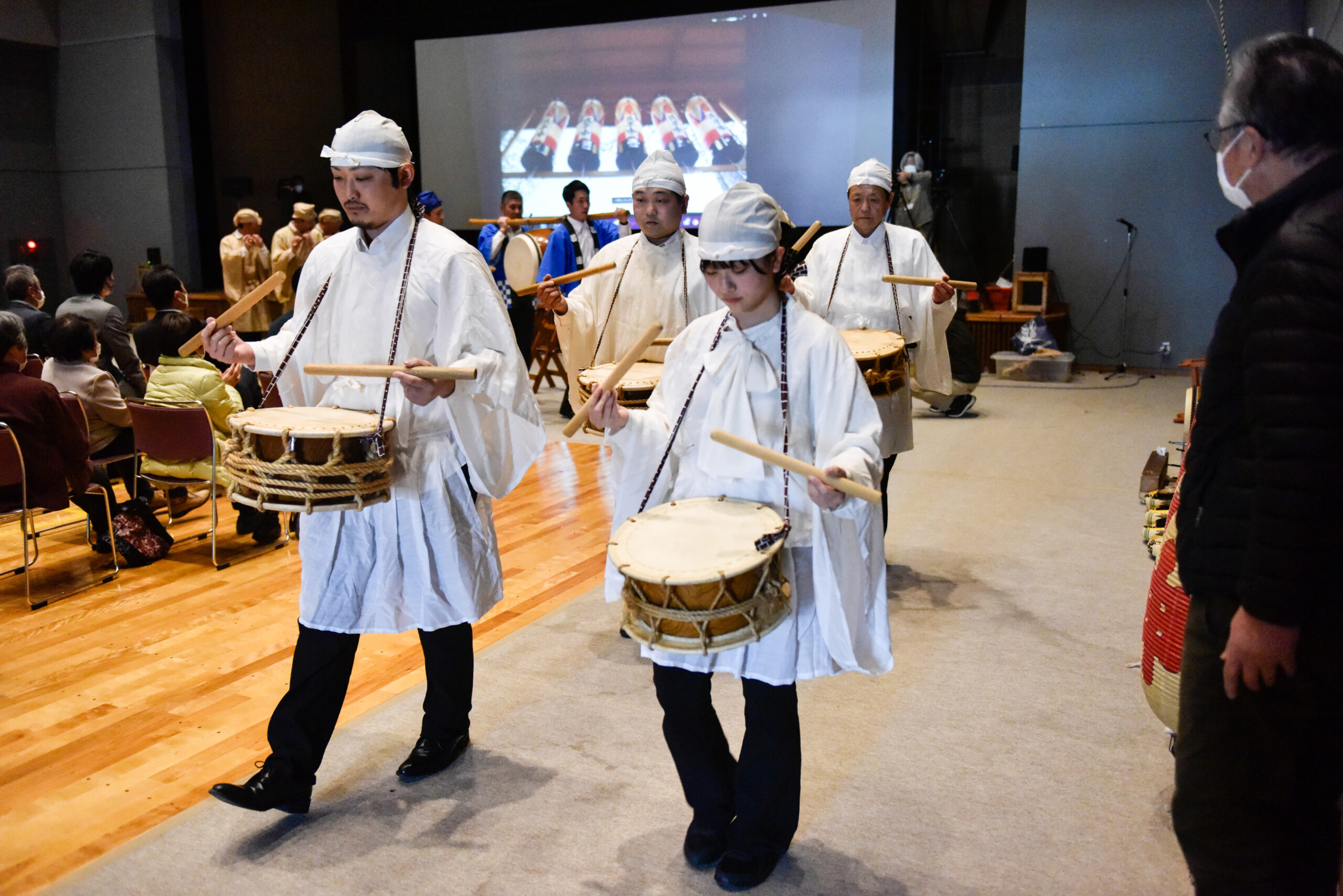 第二部では、地域の芸能として奈川で受け継がれている祇園囃子保存会による祇園囃子が演奏されました。祇園囃子は「子安諏訪神社」の祭典で、神輿の巡行の際に奏するお囃子です。大太鼓、小太鼓、笛、三味線といった楽器を奏でます。江戸時代に、小京都といわれた飛騨の高山から、野麦峠を超えて伝わったという歴史があります。