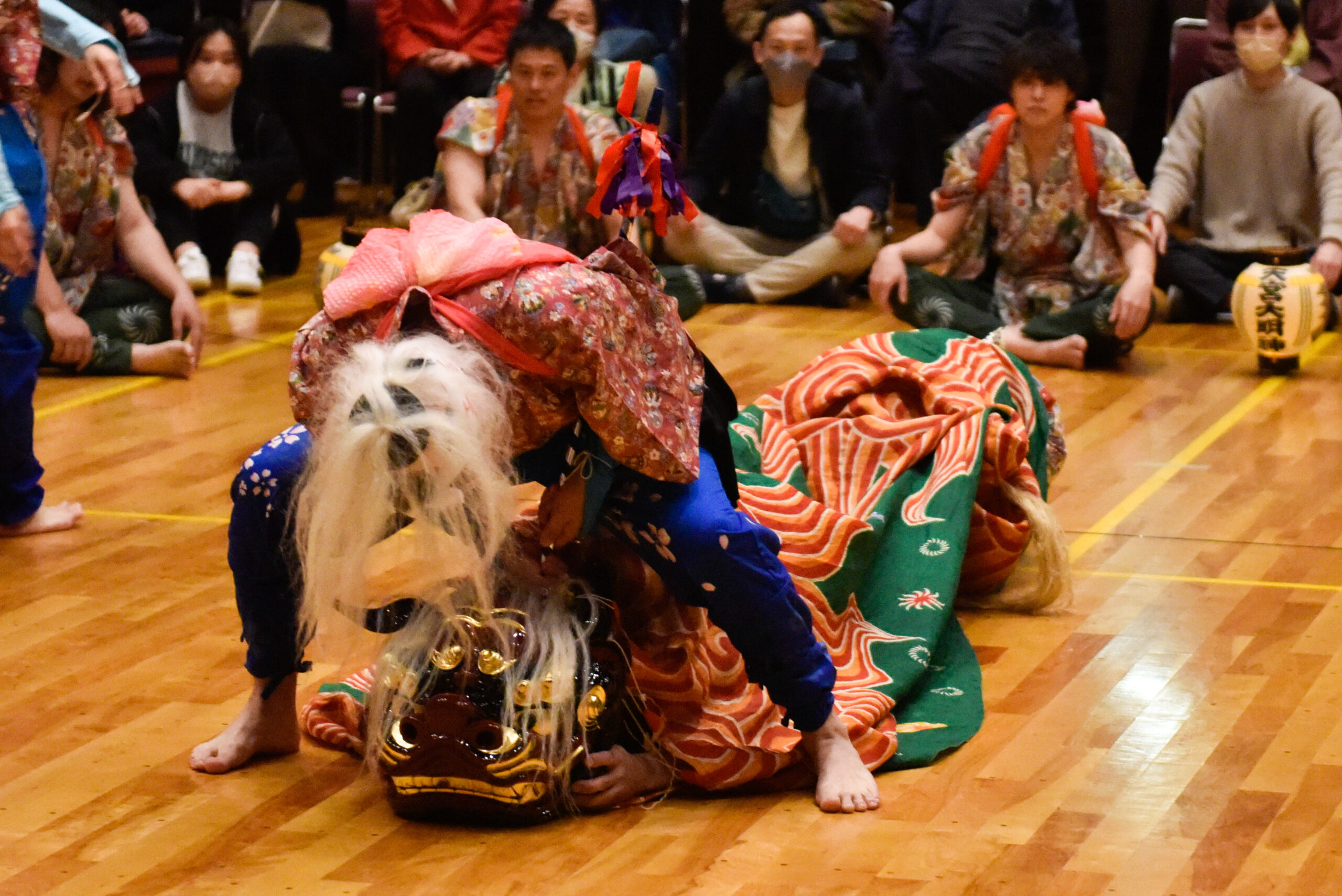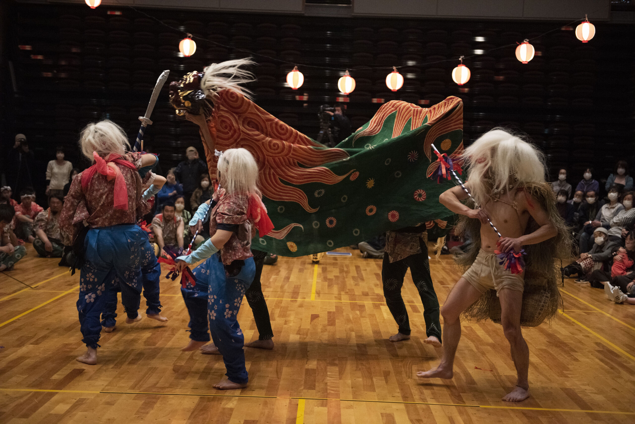 さあ、いよいよ最後は奈川獅子の演舞です。奈川獅子は、村を荒らす大獅子と獅子捕りの格闘がおこなわれ、勇壮で迫力ある演舞が見所となっています。
