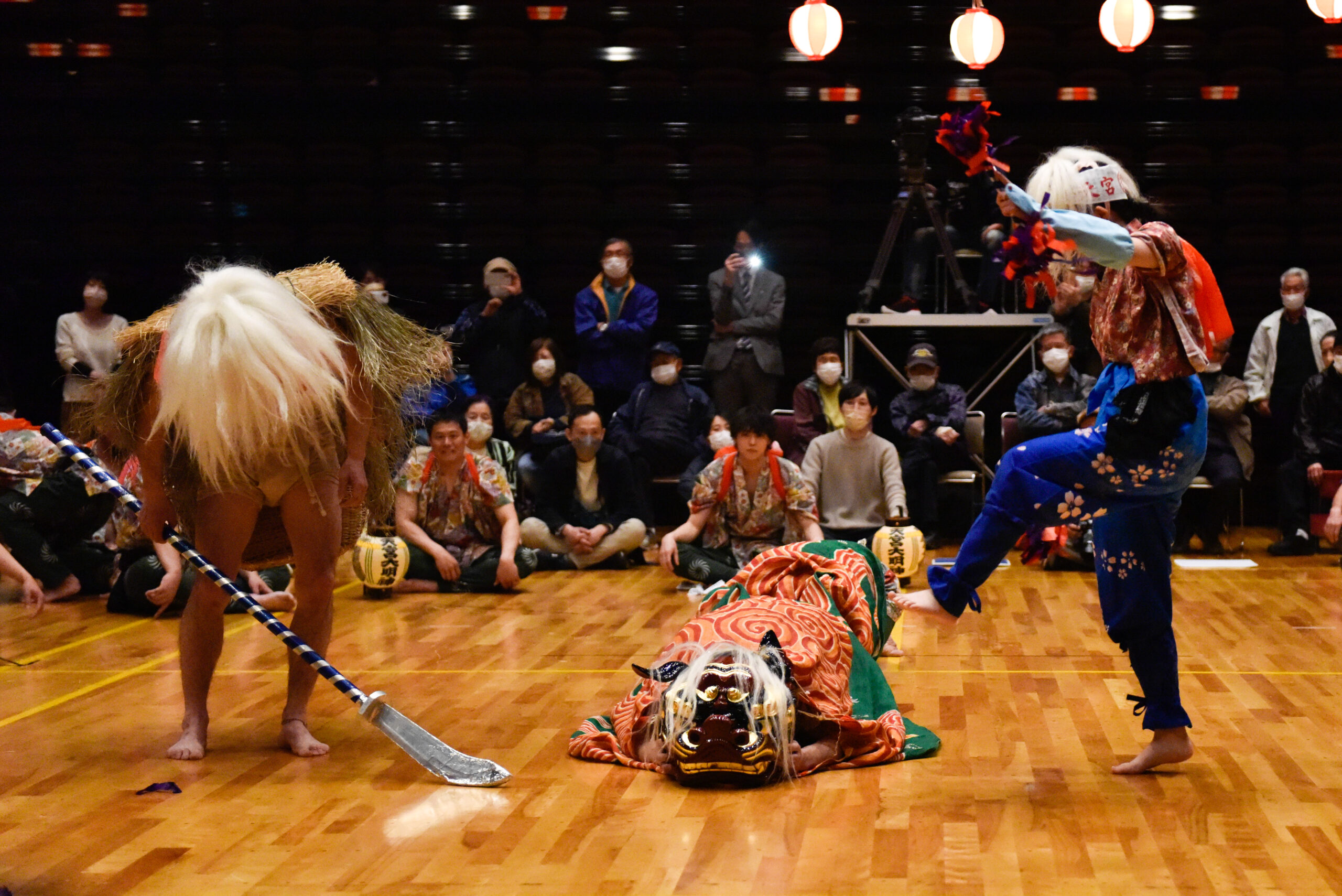 第二幕の「清森」では、獅子捕りの足元から頭上 へと攻撃する、大獅子のダイナミックな動きが特徴的でした。また第三幕の「吉崎」でもその格闘は続きます。獅子は獅子捕りをどんどん圧倒していきます。