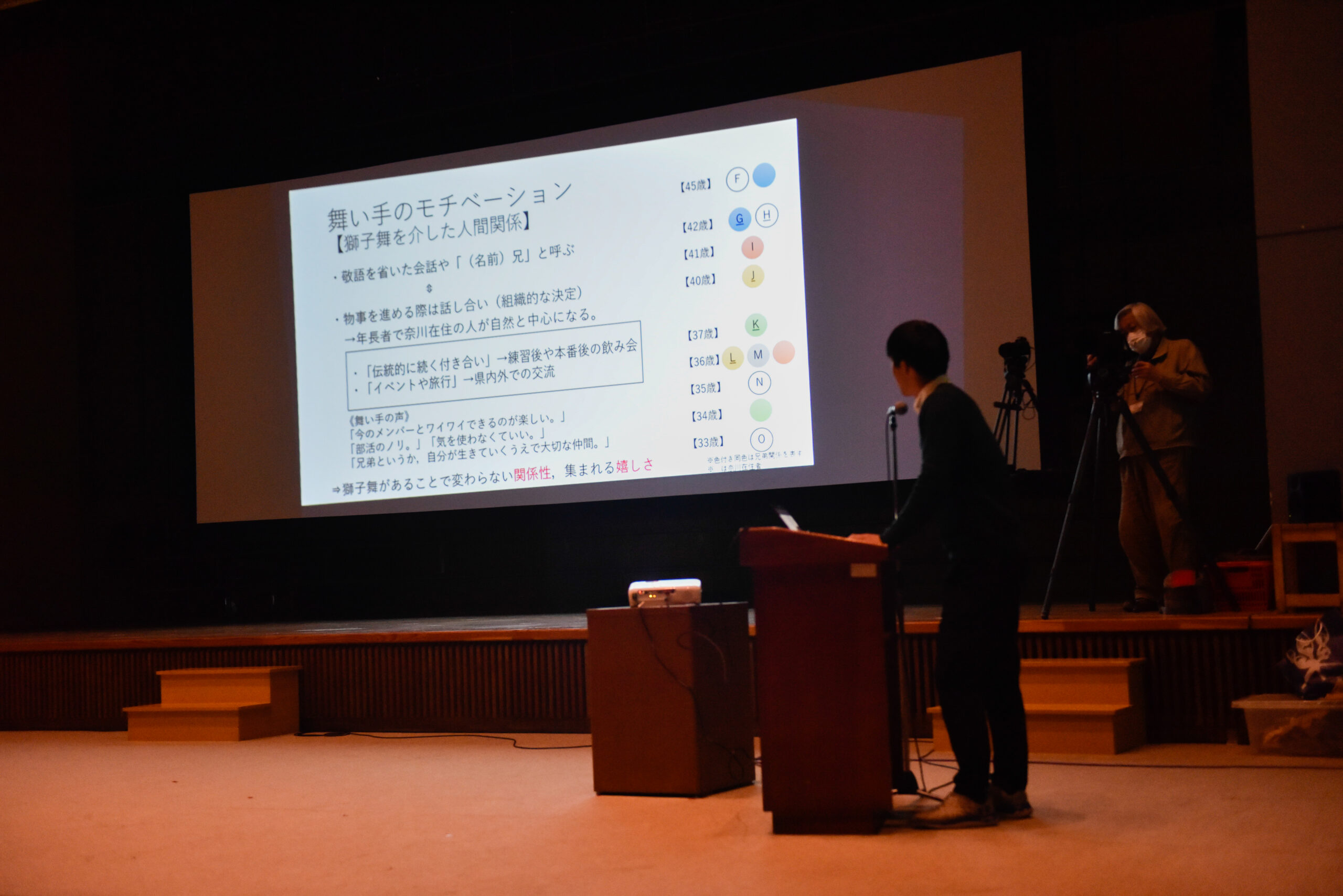まずは、「奈川獅子から考える民俗芸能の現代的意義」について、信州大学経法学部 応用経済学科3年 東大陽(ひがしたいよう)さんによる講演がおこなわれました。