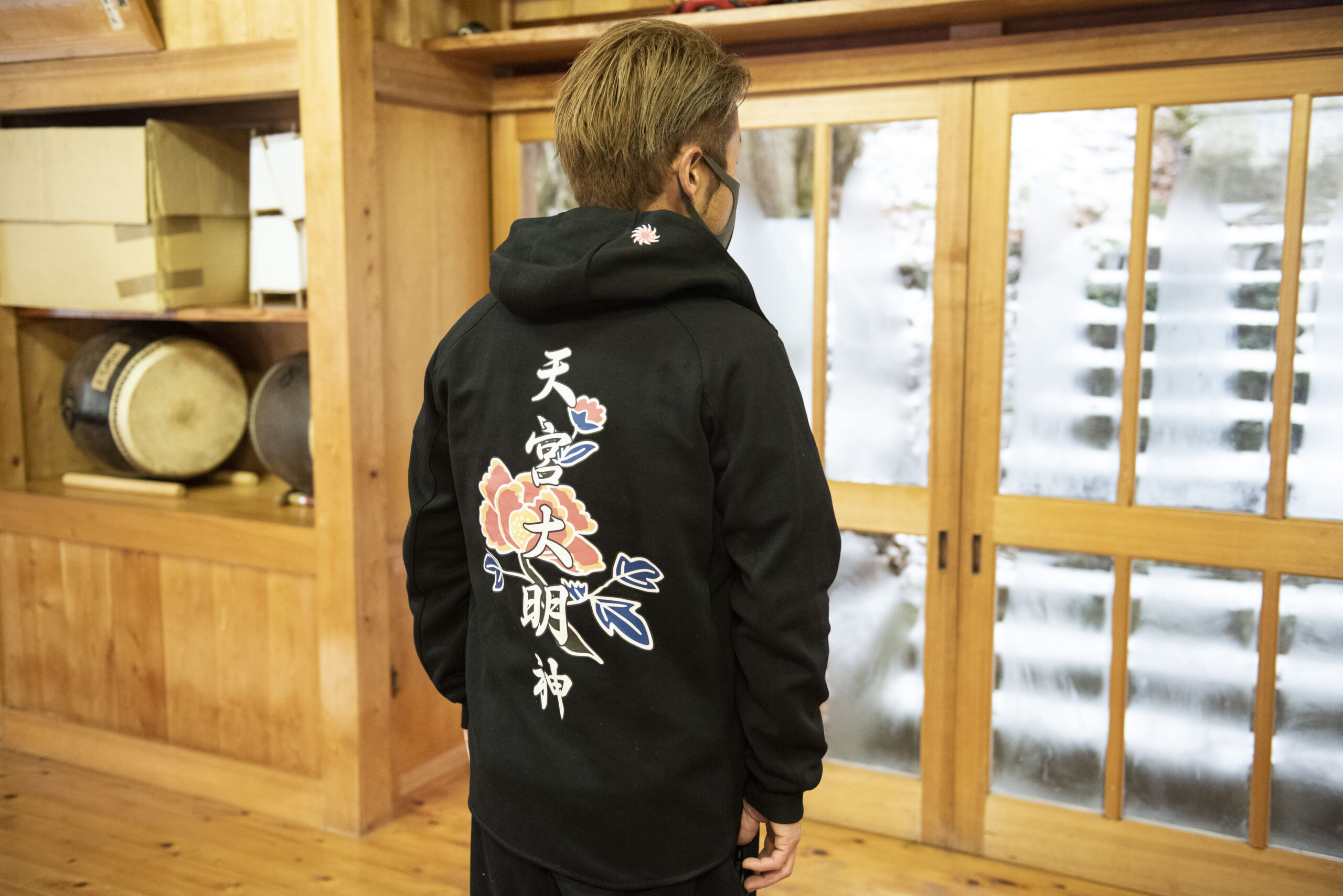 また、担い手の方々が、格好良い練習用の衣装を揃えているのも印象的でした。こちらは手作りのパーカーです。