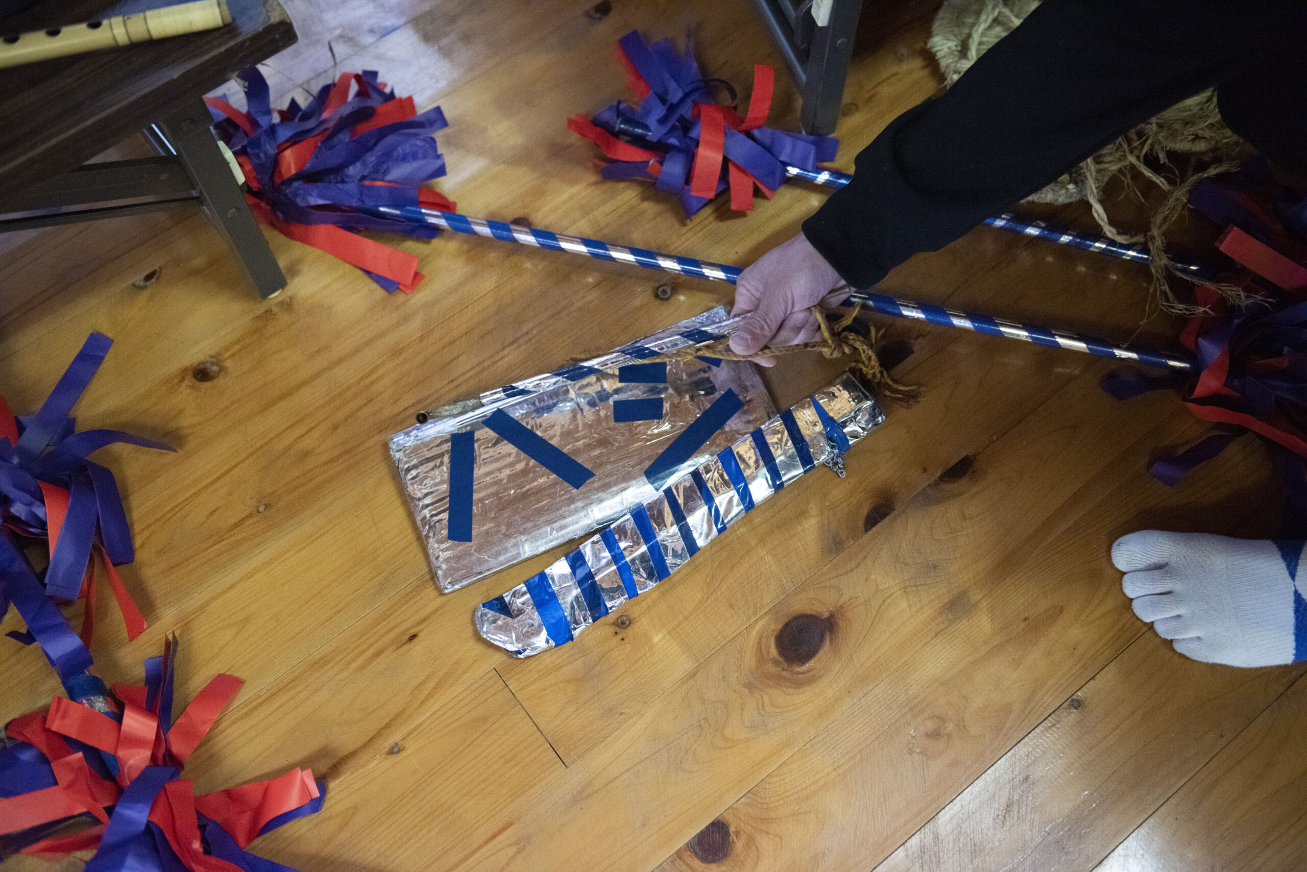 ハジメという名前の担い手さんがいるそうで、「ハジ」という名前が小刀に書かれていました。獅子舞に使われる道具に対する愛着が感じられました。